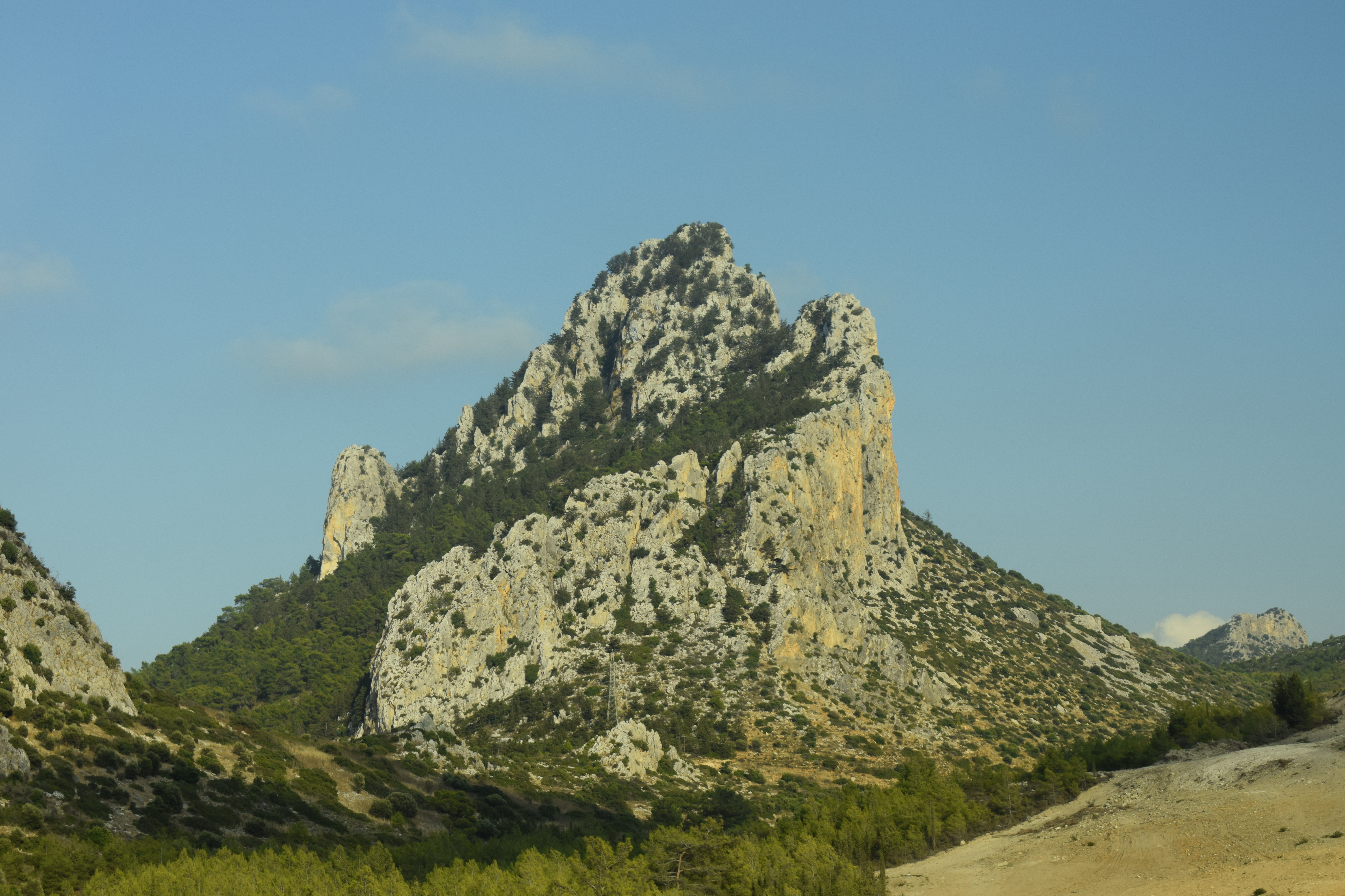 Но вернёмся к экскурсии. Остановок больше не было, однако ещё одну достопримечательность мы увидели из окна автобуса. Это красивая гора с гастрономическим названием Бешпармак (или по-гречески Пентадактилос). Конечно, к казахскому национальному блюду она не имеет никакого отношения. Просто «бешпармак» в переводе с турецкого означает «пять пальцев». Гора напоминает сжатый кулак с пятью выделяющимися костяшками.
