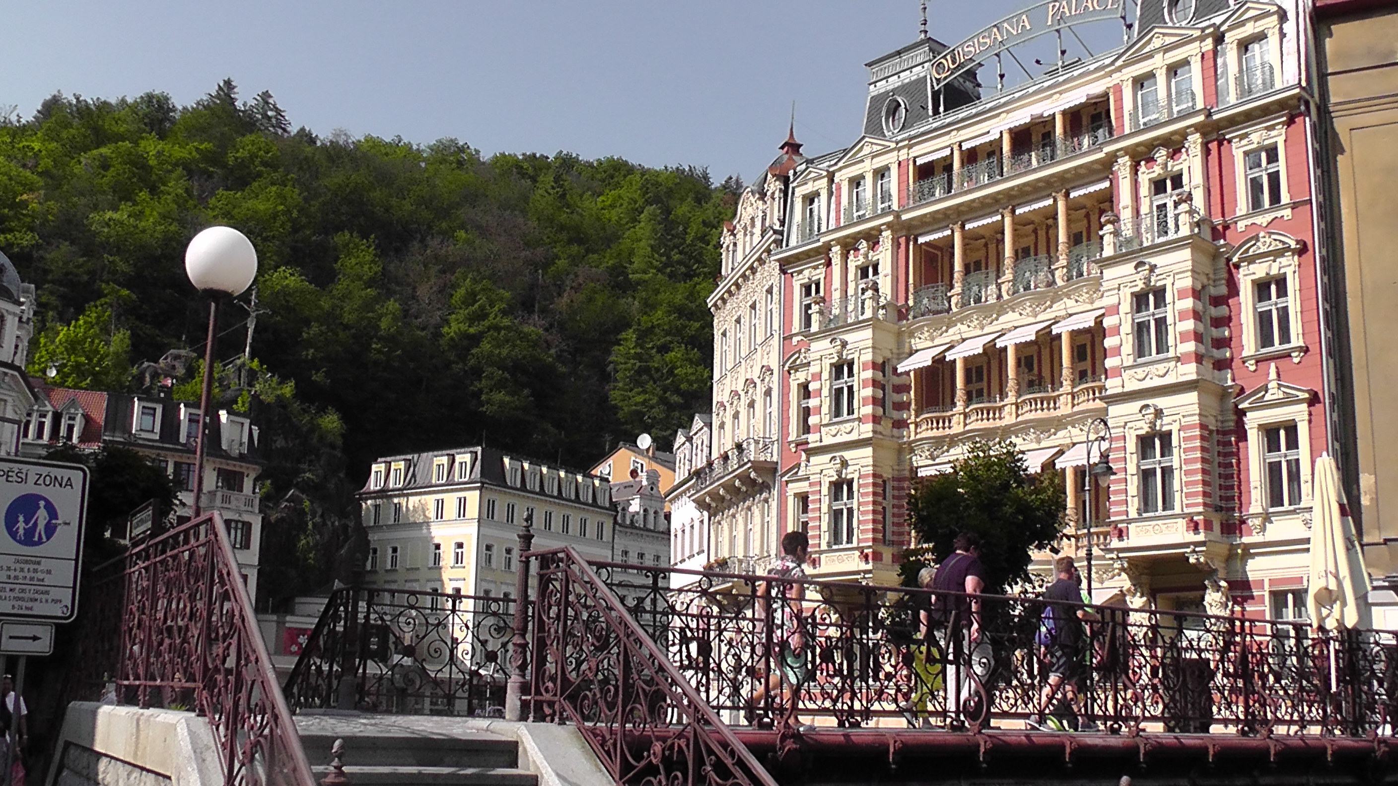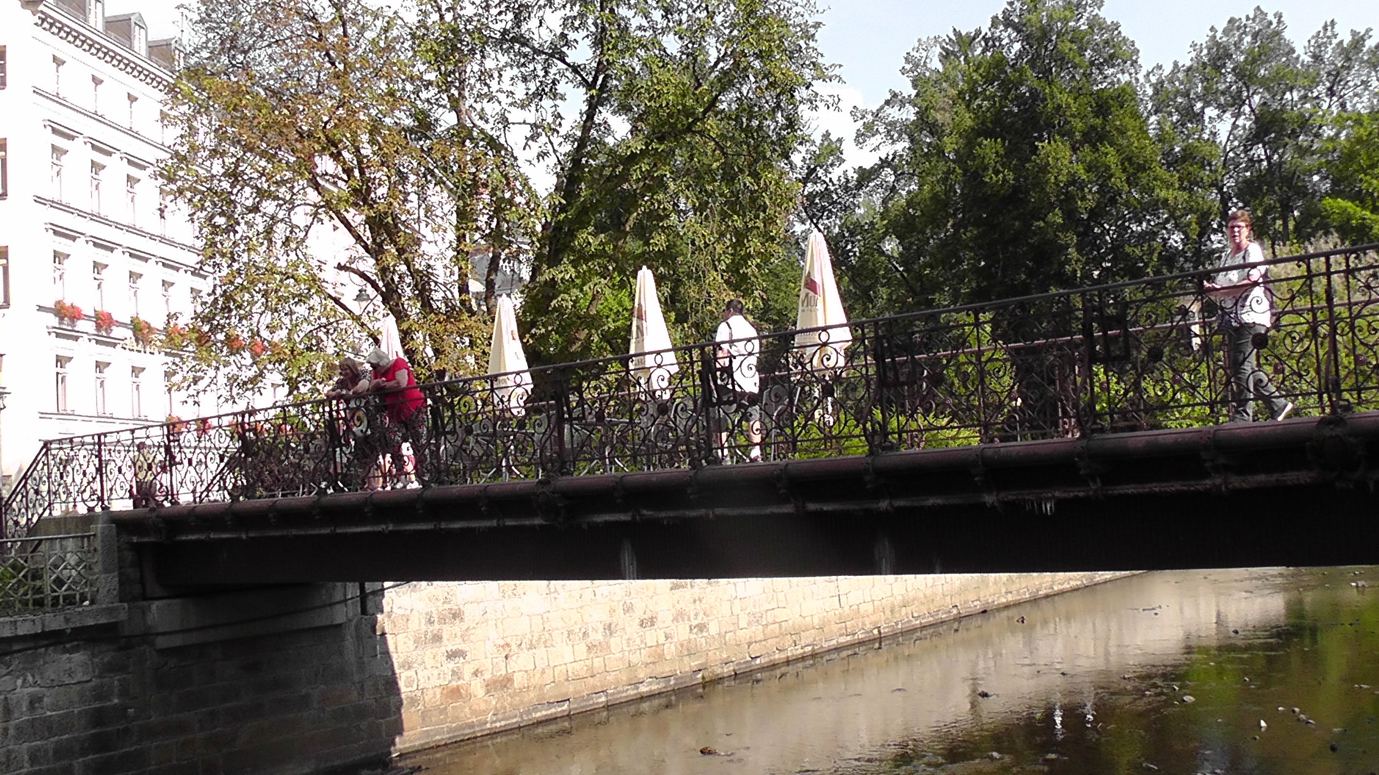 Город, как бы обнимает или сам находится в объятиях реки Тепла. Набережные являются улицами со множеством отелей и они всем строем плавно повторяют изгибы реки. Но лениво-фланирующим отдыхающим не приходится прилагать усилия для того, чтобы перебраться с берега на берег. Мосты в Карловых Варах так часто встречаются, что не дают дополнительной работы по поиску «переправы». Мосты с кованными оградами, как кружевом, ажурными брошками украшают город. Про мостики можно отдельно эссе написать только по их названиям – мосты Гоголя и жана Карро, госпитальный и японский, и все другие.