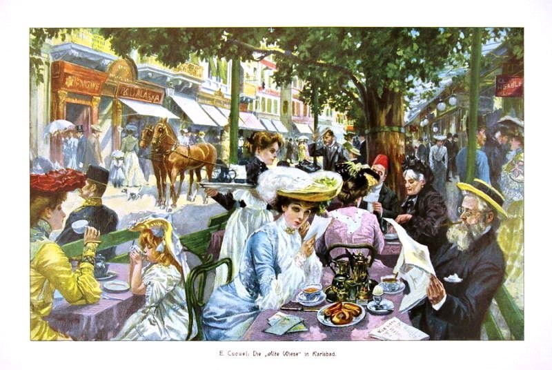 Кельнерши в черных платьях и белых передниках то и дело бегали взад и вперед между рестораном и столиками? затем сновали между ними с подносами. В определенный час утром все они оказываются заняты возвращающимися от источников курортниками, которым нравится завтракать на свежем воздухе, потребляя ту скудную снедь, которая дозволена им докторами – кофе или чай, хлеб без масла и яйца. Причем, кофе и яйца быстроногие девушки несут из кафе на другой стороне улицы, а вот хлеб посетители приносят с собой – это считается местным шиком. У дверей булочных утром народ толпится в очередях, чтобы купить булочку предпочитаемого сорта, а уже выполнившие эту миссию с гордостью разносят свои приобретения в цветных бумажных пакетиках по окрестностям, чтобы с толком и расстановкой употребить там в ресторанах, расположенных под сенью деревьев". Булочные были на разный вкус, в том числе русские. Хлеб был сухой, из одной корки состоящий, мало на привычный хлеб похож. Понятный нам хлеб в виде каравая либо кирпичиком, для лечащихся и худеющих был под запретом. Позволялась ветчина на завтрак, которую тоже покупали сами, врачи разрешали тоненькие ломтик-два. Очевидцы пишут об утренних собраниях общественности у мясных лавок - с обстоятельными обсуждениями преимуществ того или иного вида продукта. Точки общепита зачастую "прописывались" докторами, в зависимости от того, сколько времени, по их мнению, должно было пройти у пациента от приема воды до завтрака. На курорте человек должен был неукоснительно по часам есть, спать, гулять и пить водичку. В письмах Вяземского: "на водах запрещено заниматься делами". Он же в письме из Карлсбада: "Здесь не до чтения. Здесь надобно жить жизнью животного, а не умственно."