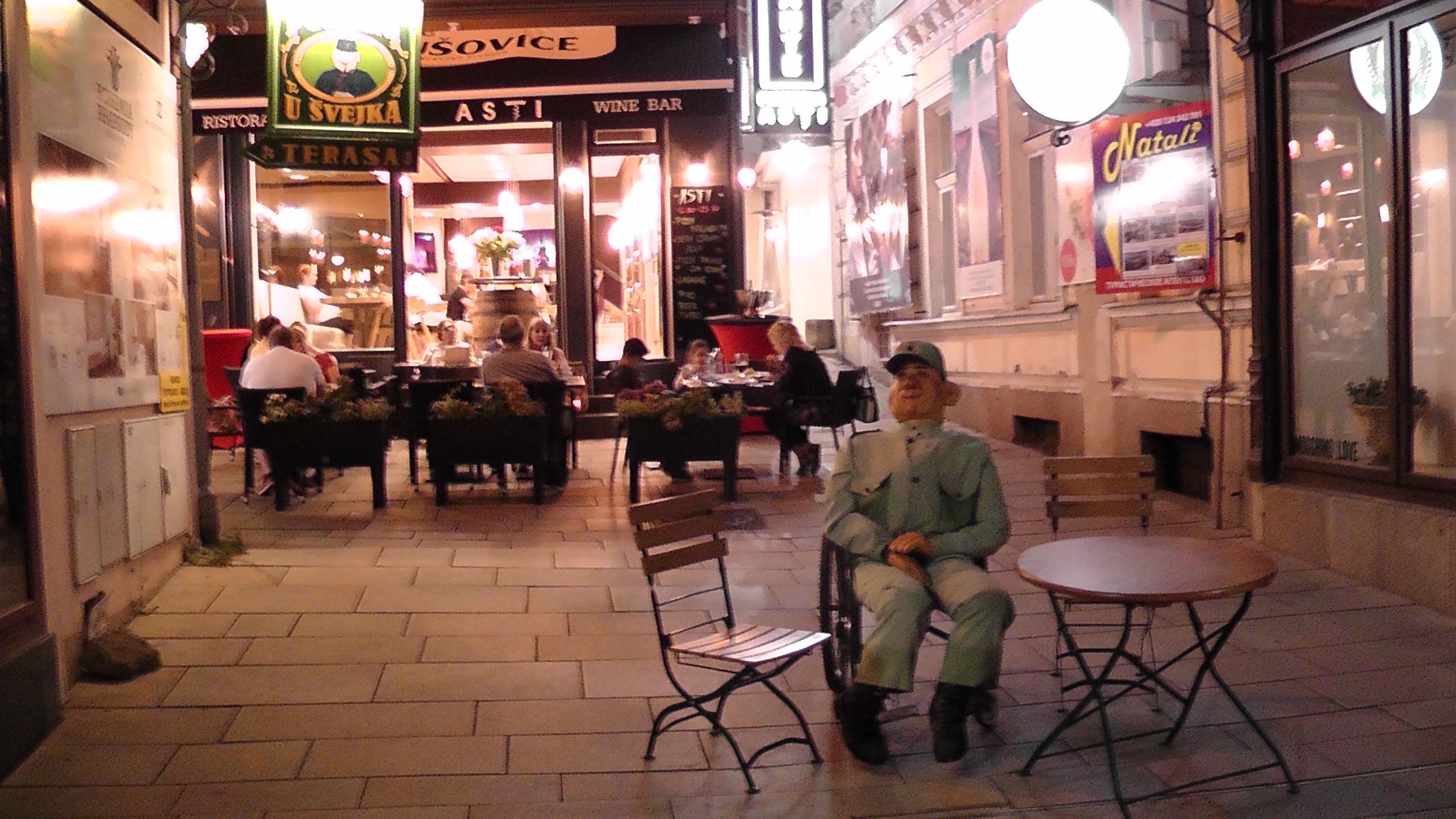 В промежутке между домами столики ресторана, ничего необычного, кроме…посетителя. За одним из столиков расположился Швейк. Наверное, кроме Санты Клауса, это самый распространенный персонаж в Чехии. Он образец, как и в сложных жизненных ситуациях сохранять чувство юмора и находить выход из «безвыходных» ситуаций. Каждый город имеет пивную либо какие другие заведения под названием Швейк.