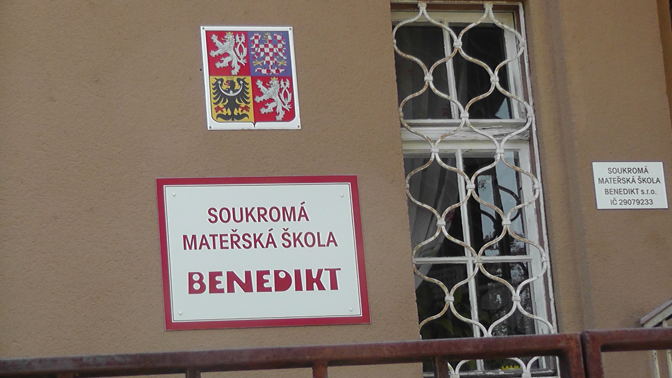 На развилке, где улица поворачивает, детская школа, если я правильно поняла по-чешски. Я не знаю чешский, надеюсь на смысловое совпадение славянских языков.