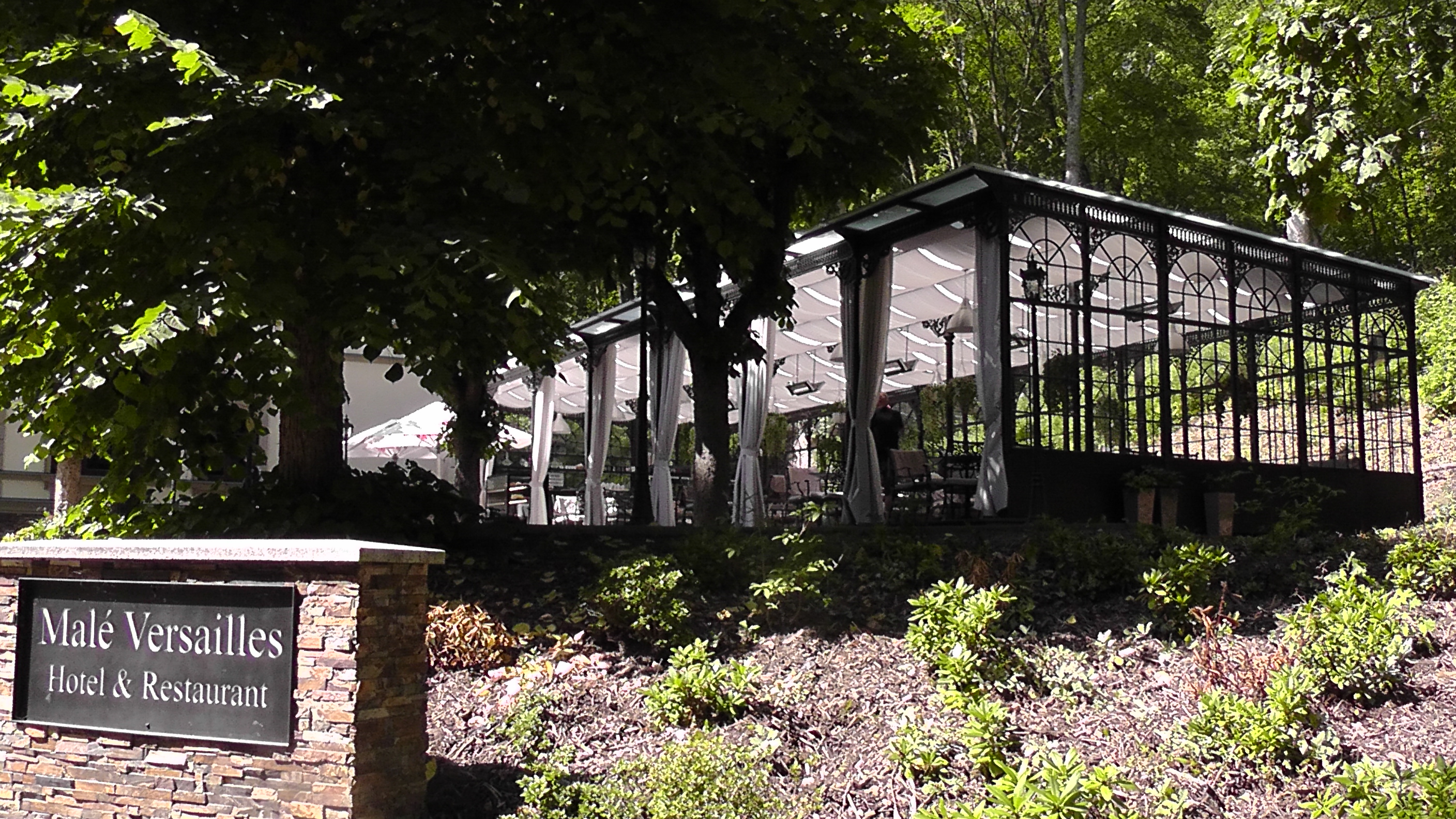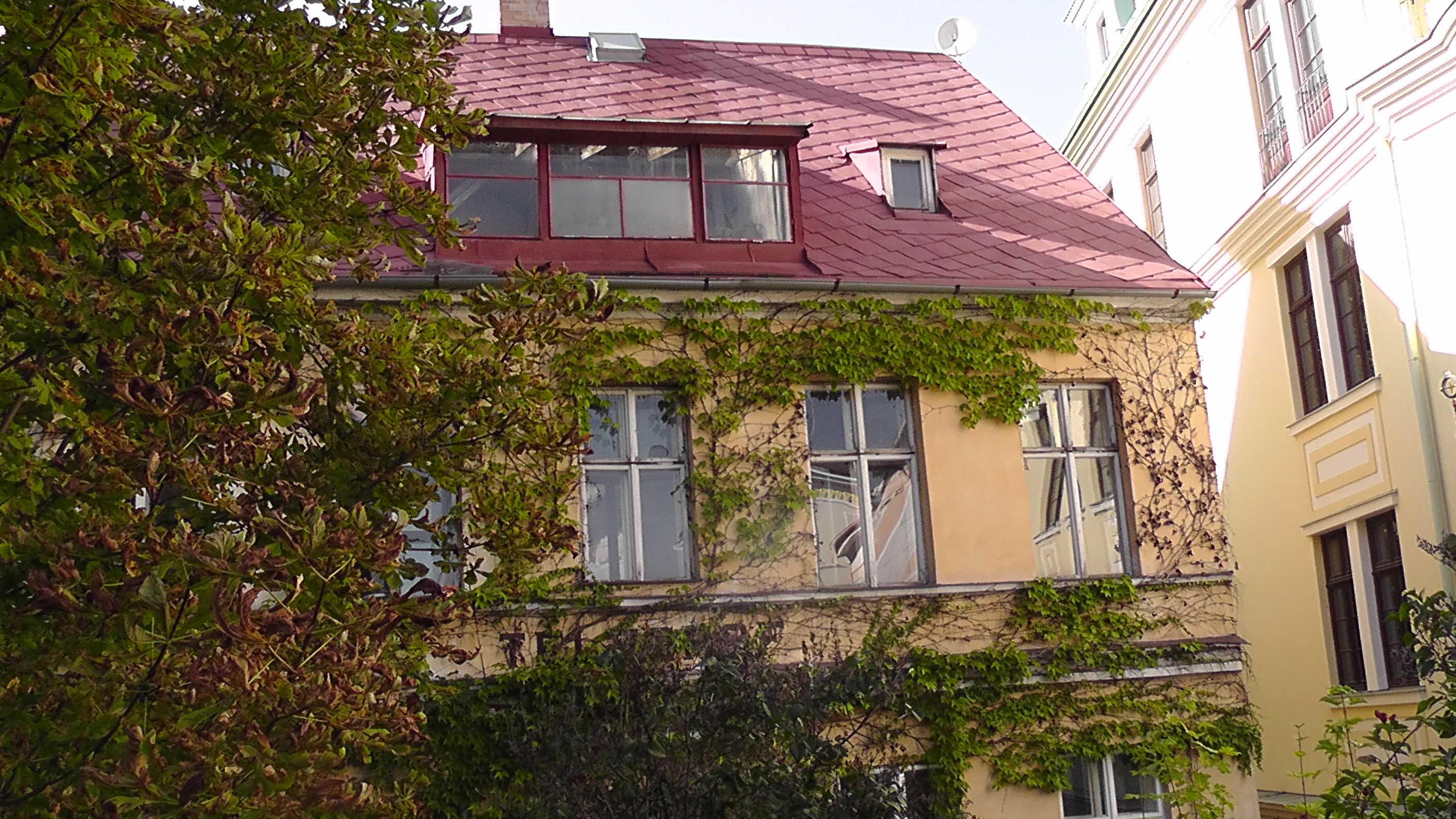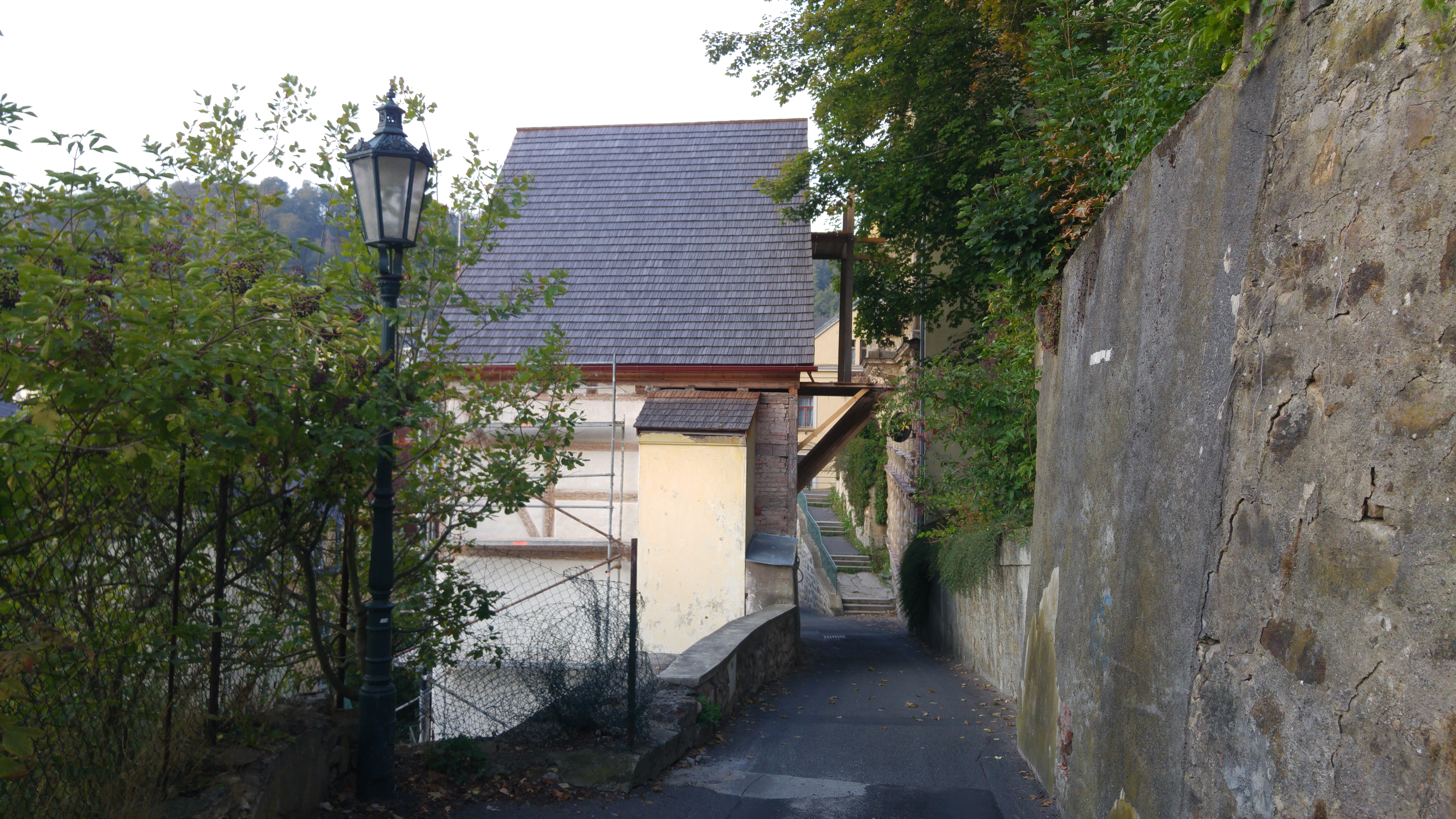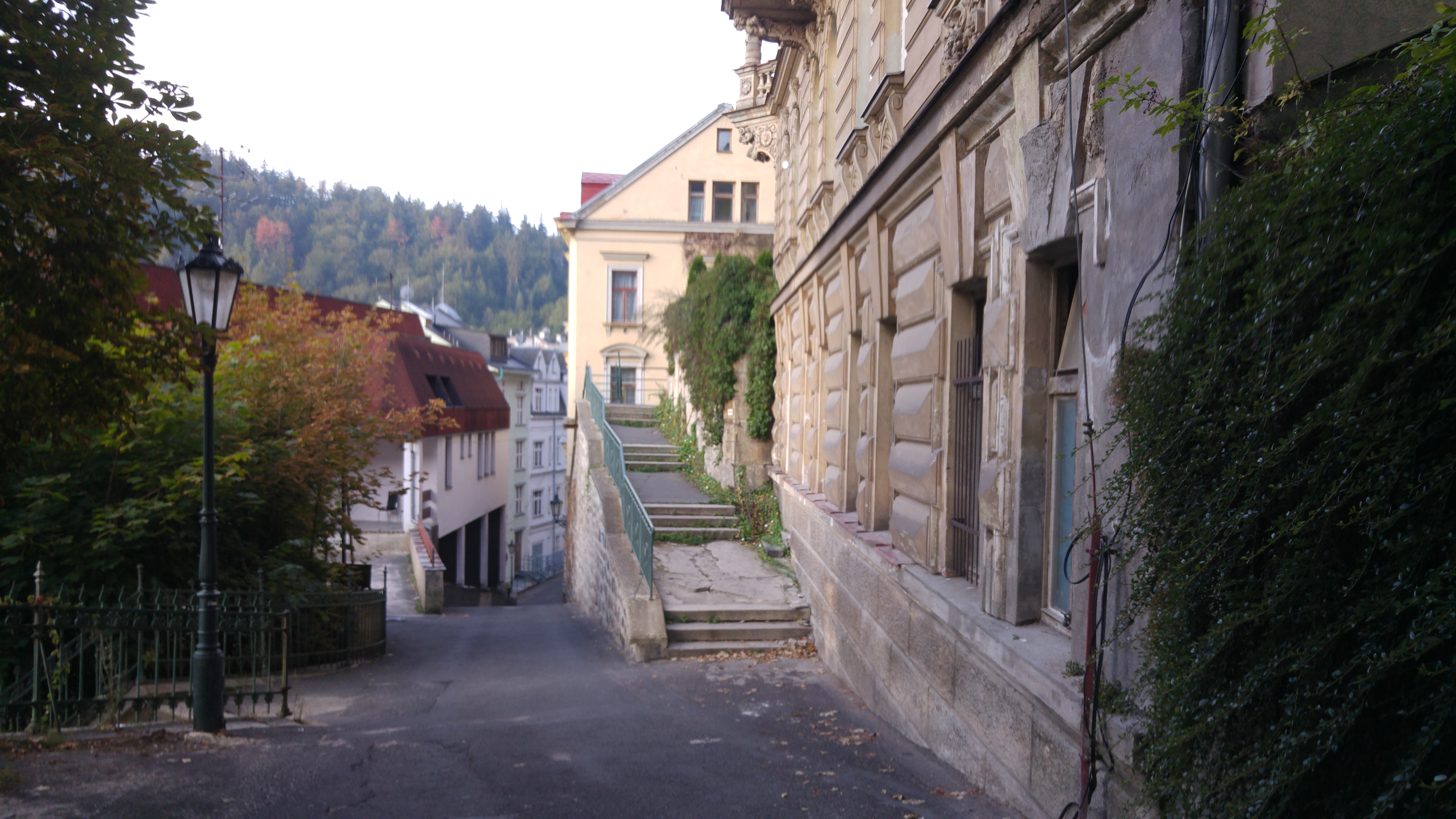 Подъем не очень крутой, но все-таки чувствуется. На одном из поворотов маленький домик, обвитый плющом. В старые времена здесь находился карловарский почтамт. На доме сохранилась надпись TELEGRAF. Окна в окна к нему стоит достроенная часть здания пансионата «Английский король».