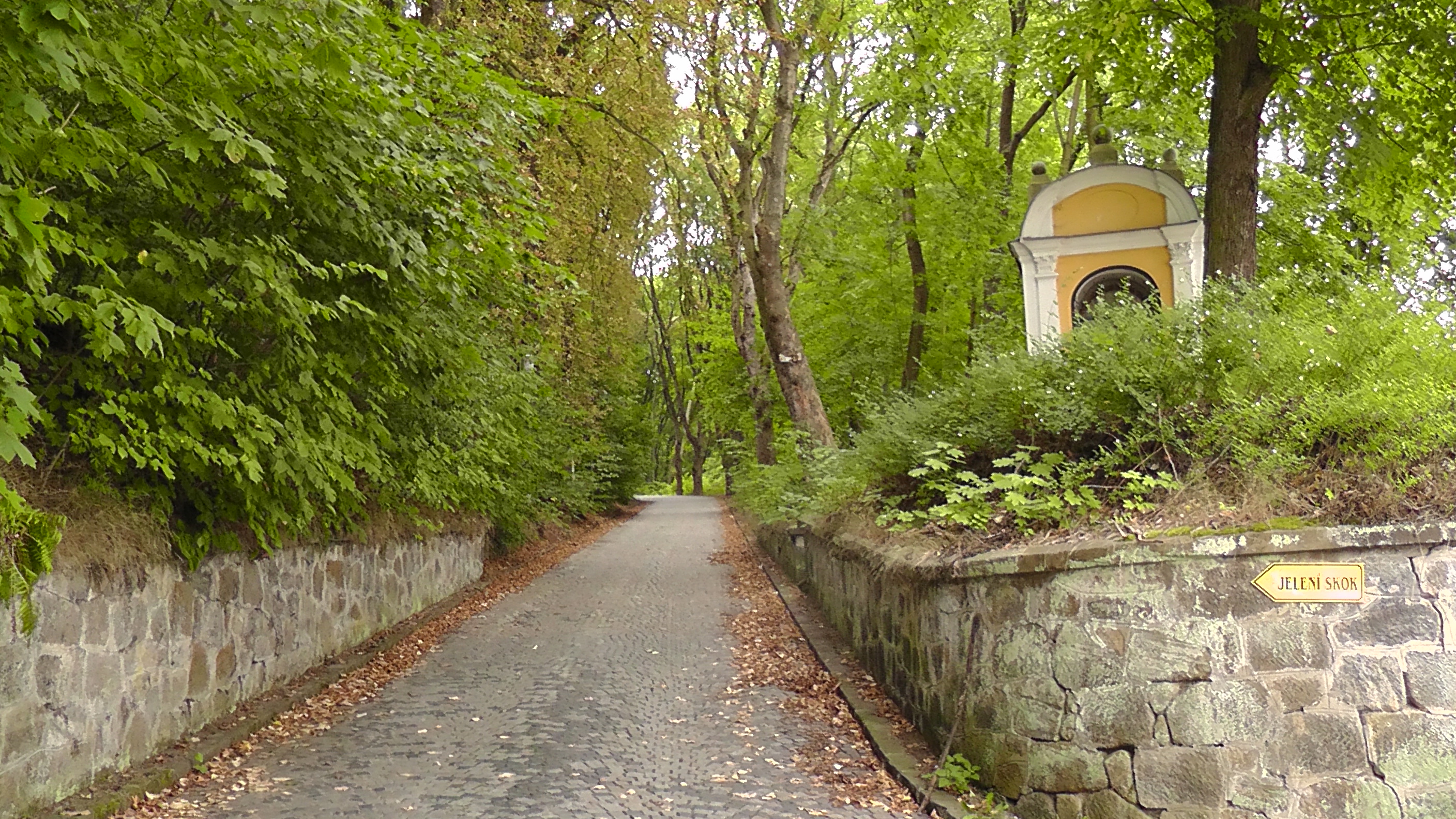 Прямо напротив входных ворот от Бристоль-палац уходит в лес булыжная дорога. По ней можно пользуясь лесными тропками, попасть к известному символу Карловых Вар – серне на скале, поставленной в 1851 году. И к Петровой горке в бюстом Петра Великого, и панорамными площадками. Шагая еще выше, доходят до башни Дианы, лесного заповедника и далее по лесам Славковских гор.