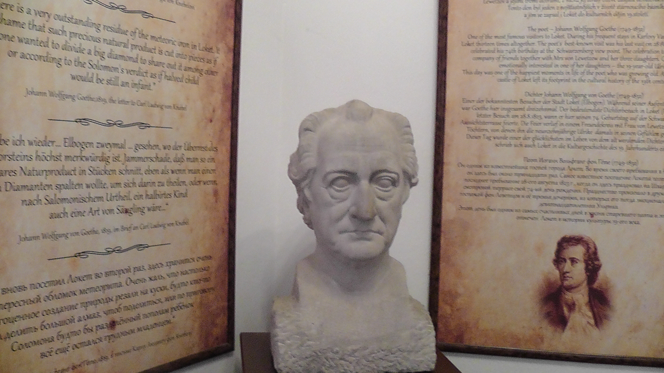 Напротив камня - бюст Иоганна Вольфганга фон Гете. И в другом помещении на стене несколько сканов исторических документов, его письма о пребывании Гете в Локете. Будучи на водах в Карлсбаде, он много раз приезжал в Локет. И не просто за историческими впечатлениями, влекли его сюда «впечатления», ранившие его душу – влюбился на старости лет в юную девушку из Локета.
