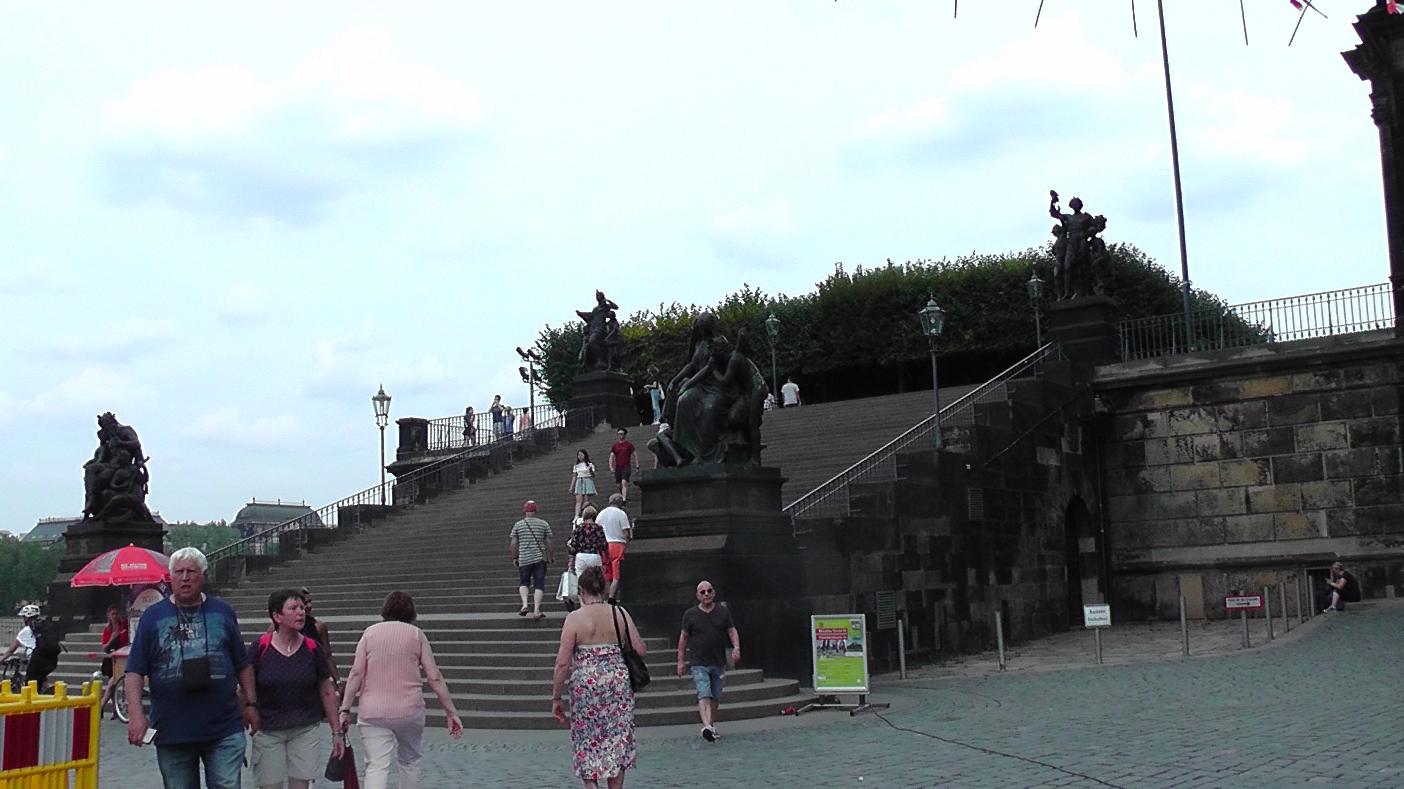 От скверика спускаемся по торжественной лестнице, той самой, что построили по приказу русского генерал-губернатора земли Саксония князя Репнина-Волконского. Благодаря губернатору и лестнице стала доступной для широкой публики набережная, до того бывшей частным владением Брюлля. Лестница украшена скульптурными композициями "Четырех периодов дня".