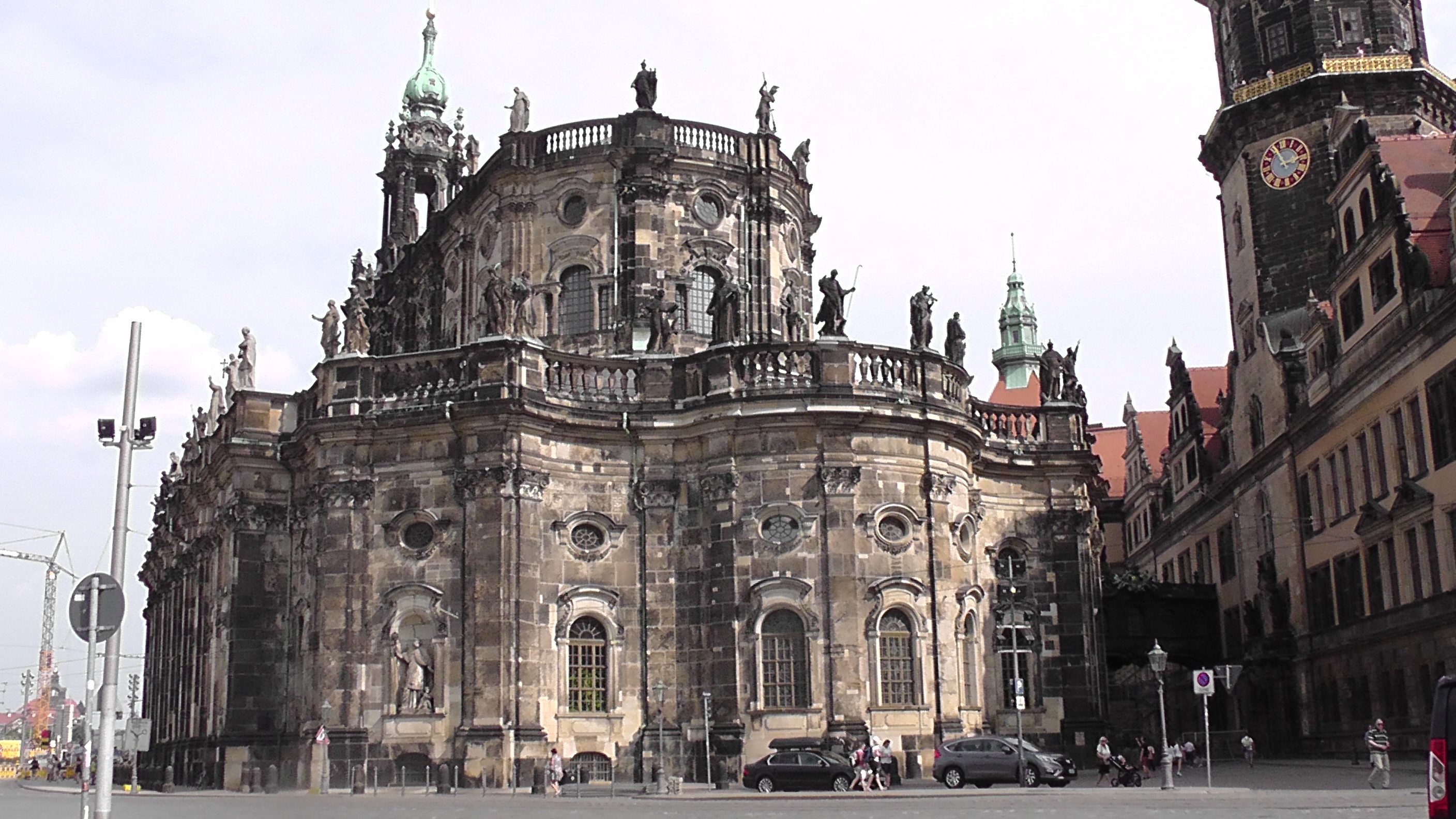 Главной доминантой площади является Хофкирхе - кафедральный собор, самый большой храм города и этой земли. В Саксонии времен Августа Сильного официальной религией было протестанство. Выпячивать приверженность католичестве даже королям было опасно. Потому был построен специальный коридор для проведения церковных процессий. В протестантском Дрездене было немыслимо проводить католические шествия на улицах. Хофкирхе стала придворной церковью уже при правителе Фридрихе Августе II. Балюстрады и ниши Кафедрального собора украшают 78 статуй из камня. Они были созданы скульптором Лоренцо Маттиелли и представляют собой изображения апостолов, святых и церковных князей высотой 3,5 м. Особенно велика колокольня собора, сколько ни пыталась захватить в объектив всё полностью, только кусками получалось сфотографировать собор вместе с колокольней.