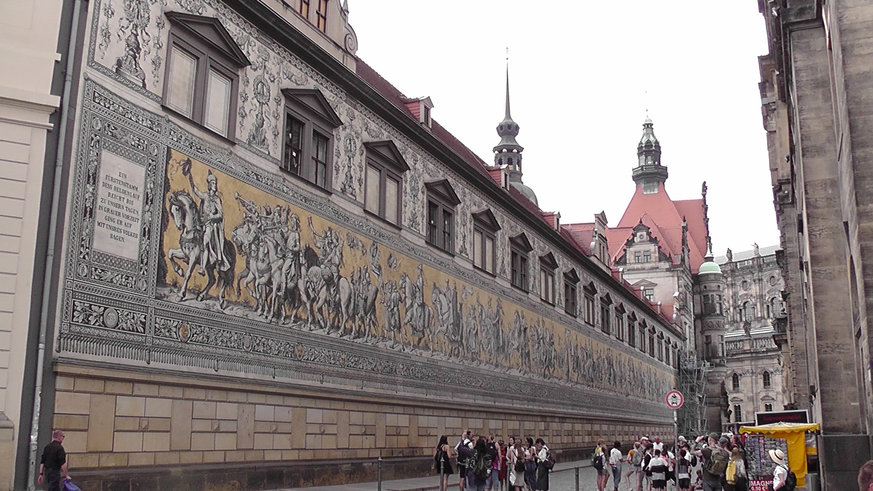 Первоначальное панно «Шествие князей» появилось еще в конце 16 века, оно было выполнено известковыми красками; во второй половине 19 столетия Вильгельм Вальтер изготовил новое панно в технике сграффито. Для защиты от влияния погодных условий, быстро выцветавшую фреску в период между 1904 и 1907 годами перенесли на плитку из мейсенского фарфора, всего 24000 плиток, и уложили на то же место. При бомбардировке города в 1945 году эта достопримечательность Дрездена почти не пострадала. Возглавляет процессию Конрад Великий, за ним шествуют другие представители королевской династии и свита. В этой череде фамильных портретов самый известный - король Август Сильный. В большинстве источников указано 93 персонажей процессии, но 94-й участник был обнаружен совсем недавно, по головному убору – не соответствовало количеству людей количество изображенных шляп. А раз есть 94-ая шляпа, то под ней должен быть и 94-ый человек:).