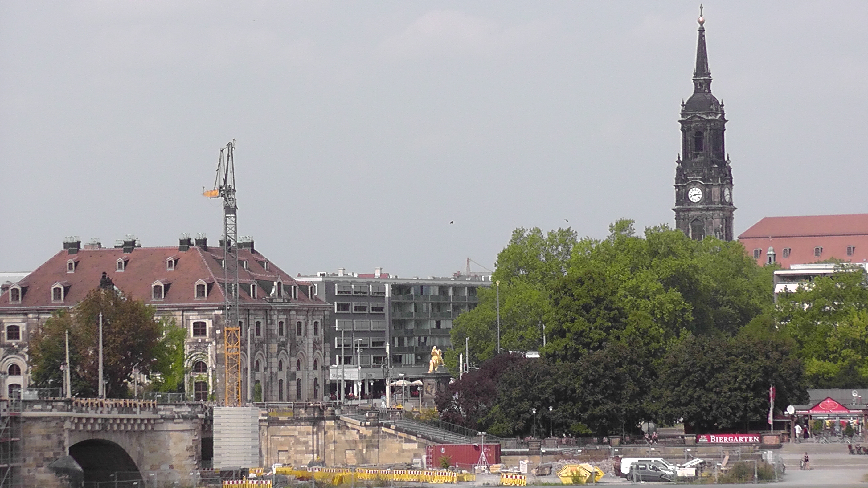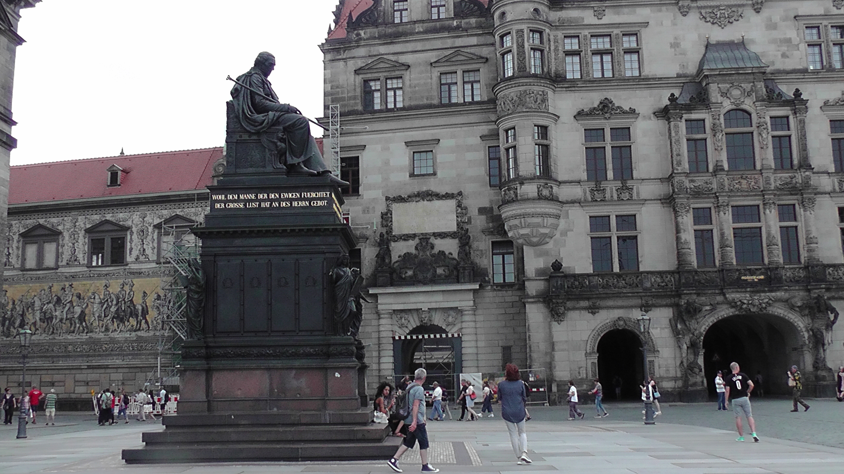 Перед Дворцовой площадью мост «Аугустусбрюкке» - мост Августа, сейчас на реконструкции. Над рекой в городе построены девять мостов. Сразу за мостом виднеется конный позолоченный памятник королю Августу, тому самому, чье сердце похоронено в кафедральном соборе. Курфюрст Август «скачет» в сторону Польши, он же являлся и тамошним королем. Во время Второй мировой войны позолоченный медный памятник разобрали и вывезЛИ в замок Пильниц на хранение, а после войны опять поставили на старое место.