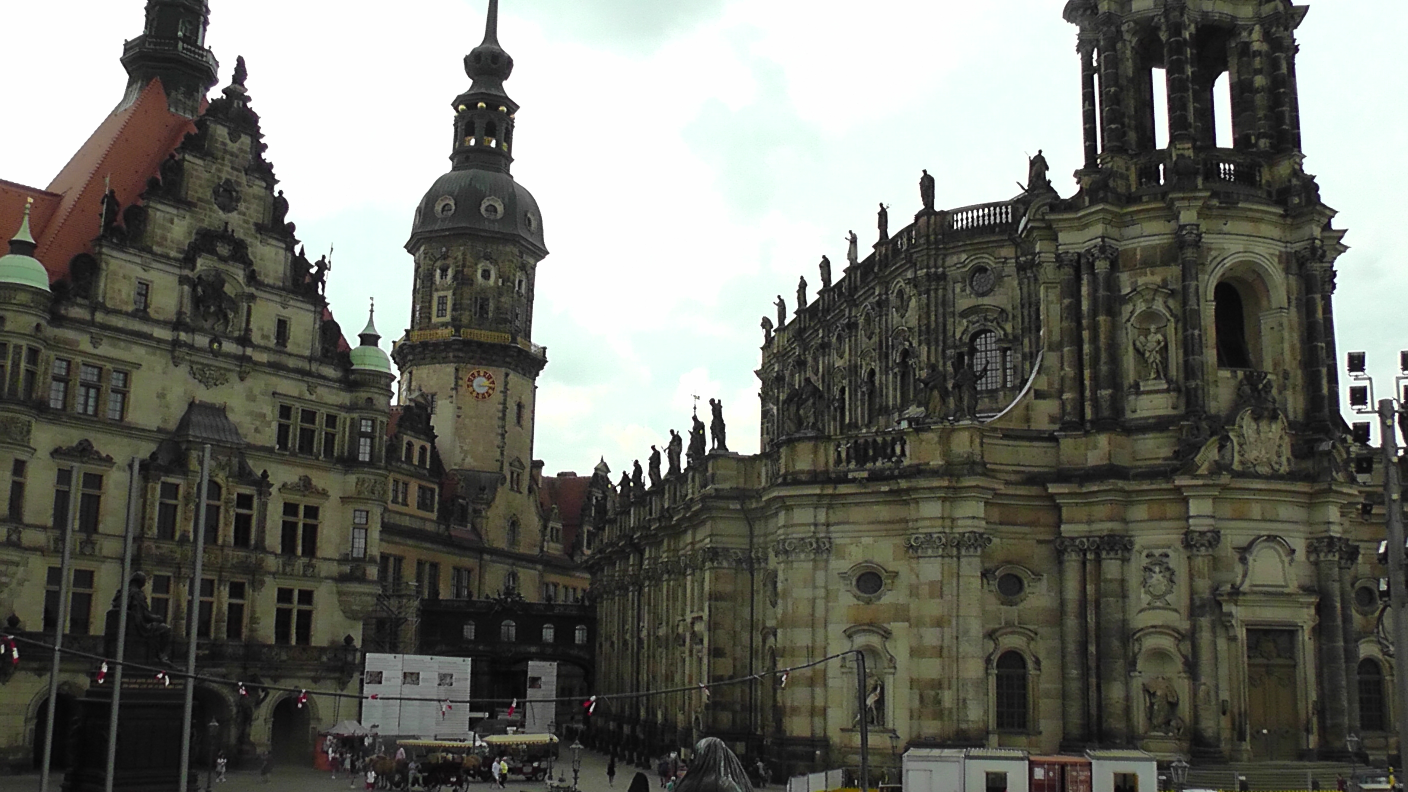 Площадь с собором создают острый угол треугольника, две стороны которого ведут к набережной Брюлля и Цвингеру. Этот треугольник вмещает практически основное, что восстановлено из исторического Дрездене. До приезда, пока своими глазами не увидела, представлялся огромный средневековый центр, как показывали в документальных фильмах и рассказывали по ТВ. На самом деле таких зданий кучка и все они на одном пятачке расположены. Восстановлено уже немало, но ожидала увидеть гораздо больше. Есть только несколько построенных практически заново по старинным образцам зданий, прилепившихся к королевскому дворцу и на набережной. Думаю, со временем к ним прибавятся другие вновь отстроенные «старые» здания. И в будущем город вернет утраченное. Как строили веками, так и на восстановление нужно много времени.
