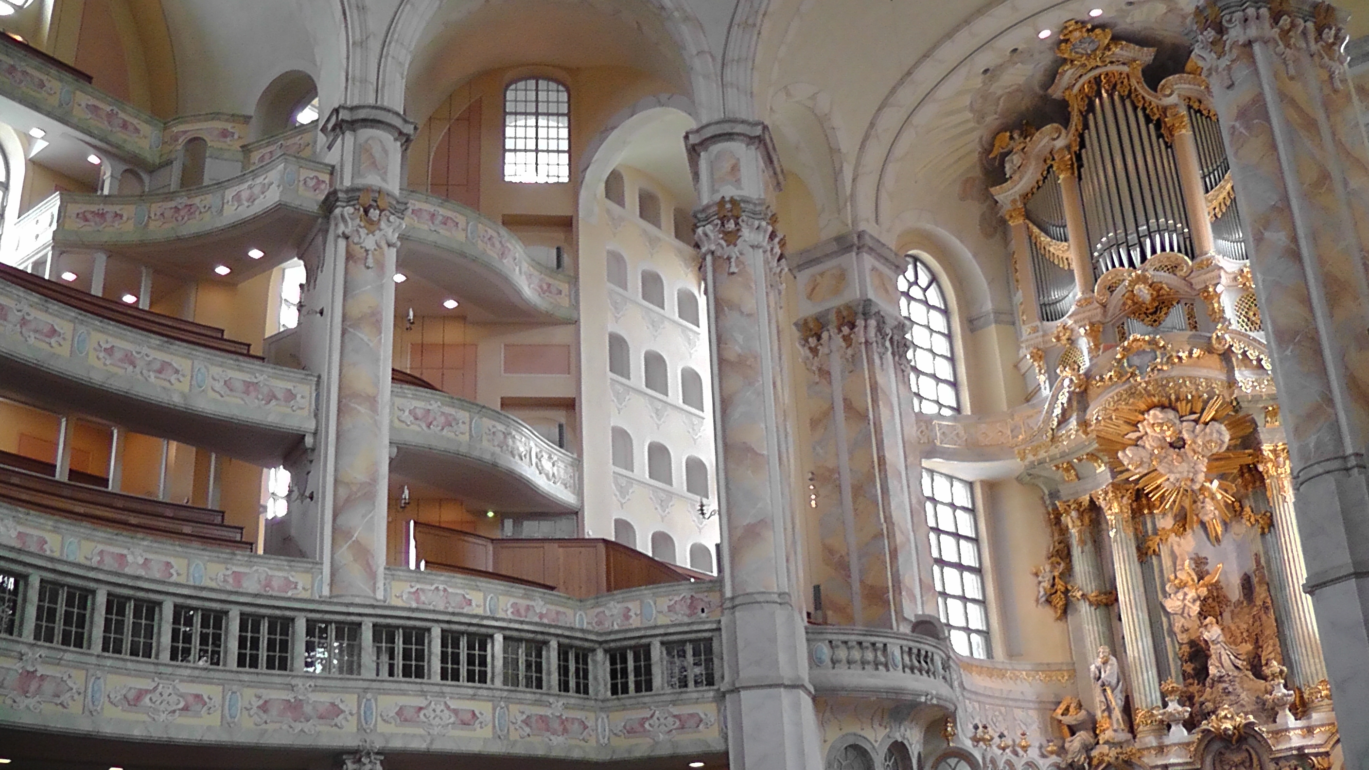 От привычных мрачных европейских соборов, Frauenkirche отличается особенной нарядностью. Интерьер выдержан в белых, золотистых и салатовых цветах. Прозрачные, лишенные витражей окна, заливают здание cобора солнечным светом со всех сторон.