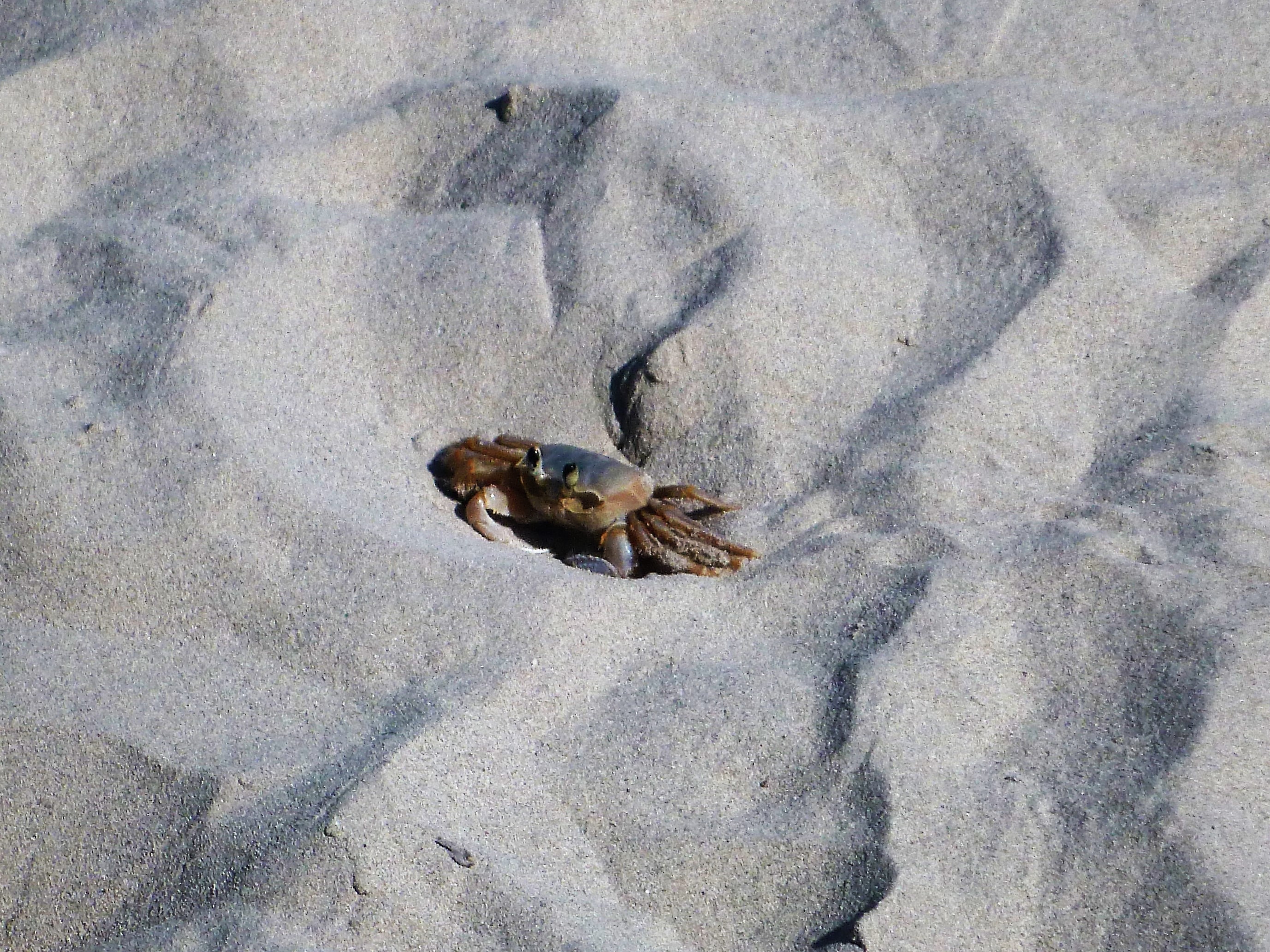 Затем мы пошли на пляж. Расстелили мат недалеко от чьих-то вещичек (хозяев не было видно), намазались и полезли в воду. Вода была чрезвычайно приятная, но волны чуть выше приемлемого для нас размера, поэтому плескаемся у берега. Вокруг проносятся чайки и пеликаны, в полёте смахивающие на птеродактилей. Иногда они ненадолго зависают над одним местом, а потом вертикально падают в воду, по пути вращаясь в штопоре. Чайки практически сразу вылетают из воды, а пеликаны ещё некоторое время сидят на поверхности, проглатывая добычу. Это интересно наблюдать даже издали, но иногда мы были в эпицентре этой охоты, и чайки врезались в воду буквально в метре от нас.