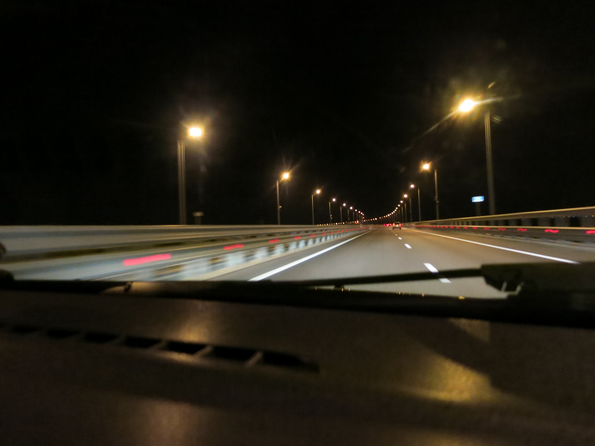Крымский мост состоит из двух параллельных мостов — автомобильного и строящегося рядом железнодорожного. Длина моста — 19 км. К сожалению, в 23.00 кроме ярко освещенной дороги, вокруг ничего не было видно.
