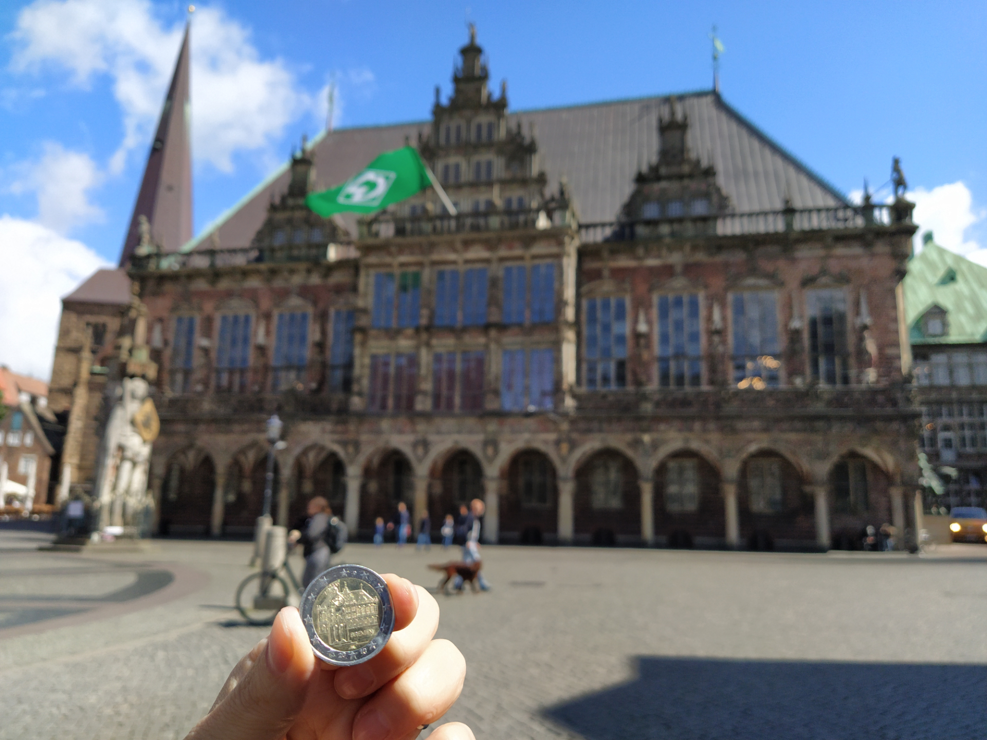 Сами же бременцы своим символом считают другой, гораздо более древний памятник: Роланду. Считается, что пока стоит Роланд, будет существовать и город. Неясно, кто этот Роланд, и чем он занимался, и почему удосужился памятника от горожан. Первый Роланд, сооружённый бременцами, был деревянным и сгорел в том же дремучем средневековье. Ему на смену срочно возвели нынешнего, каменного. И снабдили его щитом с двуглавым орлом. До XIX века его ярко раскрашивали, потом перестали. С тех пор стоит он, серый, грубый, десятиметровый истукан, на страже города, а с недавних пор смотрит на европейцев и с памятной двухъевровой монеты «Бремен».