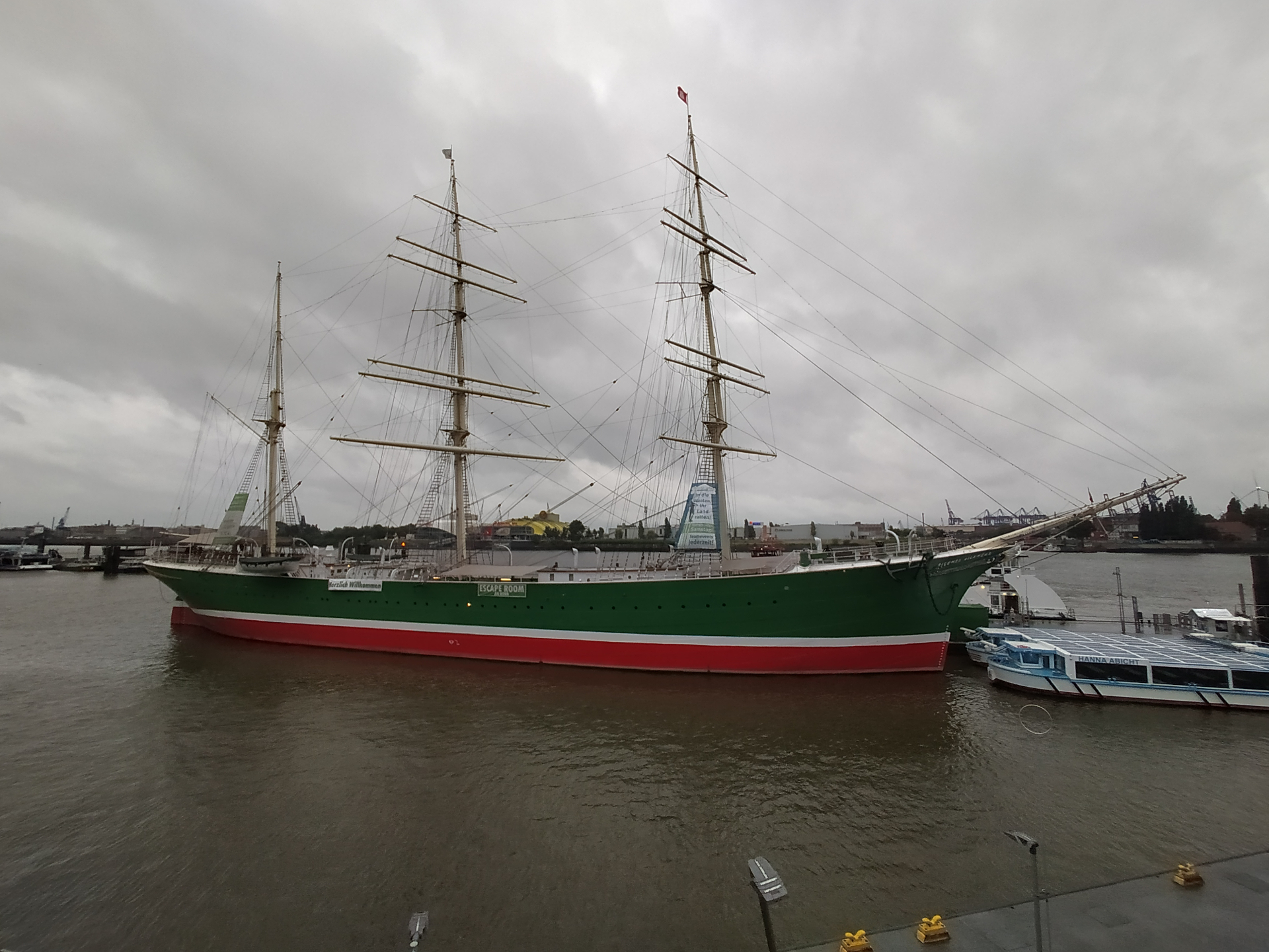 Мы идём по набережной вдоль Эльбы. Здесь полно ресторанов, остановок речных трамвайчиков. Рядом стоят навечно пришвартованные старинные судна: парусник «Рикмер Рикмерс», советская подводная лодка и самый «молодой» из них белоснежный лайнер «Кап Сан Диего». Все они служат сейчас музеями, а последний корабль – ещё и отелем.