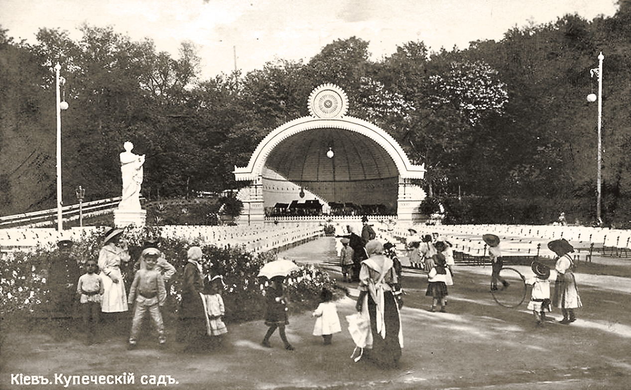 Сад Купеческого собрания и кафешантан «Шато де Флер», устроенный в 1862 г., были частью парка между зданием нынешней филармонии и стадионом «Динамо». «Шато де Флер» был необычным для Киева того времени. Ведь там вместо деревьев красовались роскошные, яркие клумбы. Цветочная красота была заслугой умелого садовника Карла Христиани. Поэтому горожане называли этот парк еще "Цветочный парк". На территории над зданием Купеческого собрания и на средства предпринимателей появились постройки, хоть и деревянные, но спроектированные самим арх.Николаевым. Так, на возвышенном месте был выстроен увенчанный куполом летний клуб с открытой концертной эстрадой-раковиной, буфетом, видовой беседкой и прогулочной площадкой. Увеселительные заведения Купеческого сада пользовались большой популярностью. Публика готова была платить 40 коп. за вход - дневной заработок рабочего, и оставлять еще большие суммы в ресторане, любуясь панорамами на Днепр. В саду играл оркестр, в летнем театре шли представления театральных и опереточных трупп. Здесь давали спектакли с участием прославленных корифеев - Николая Садовского и Марии Заньковецкой, Марка Кропивницкого и Панаса Саксаганского. Труппа МХТ побывала в Киеве в 1912 г. Cуществует коллективный фотоснимок на видовой площадке Купеческого сада. На фотографии Станиславский, Немирович-Данченко, Москвин, Качалов и другие артисты. Киевские мальчишки через щели летнего театра смотрели проходящие там спектакли. Среди них был и Костя Паустовский, и Миша Булгаков, и Саша Вертинский. Александр Вертинский потом сам выступал на этой сцене. Сад Купеческого собрания слыл наиболее приличным и даже аристократичным местом гулянья киевлян в то время. Привлекал и невероятно красивым видом на Днепр и старую часть города, Подол, с обзорной площадки.
