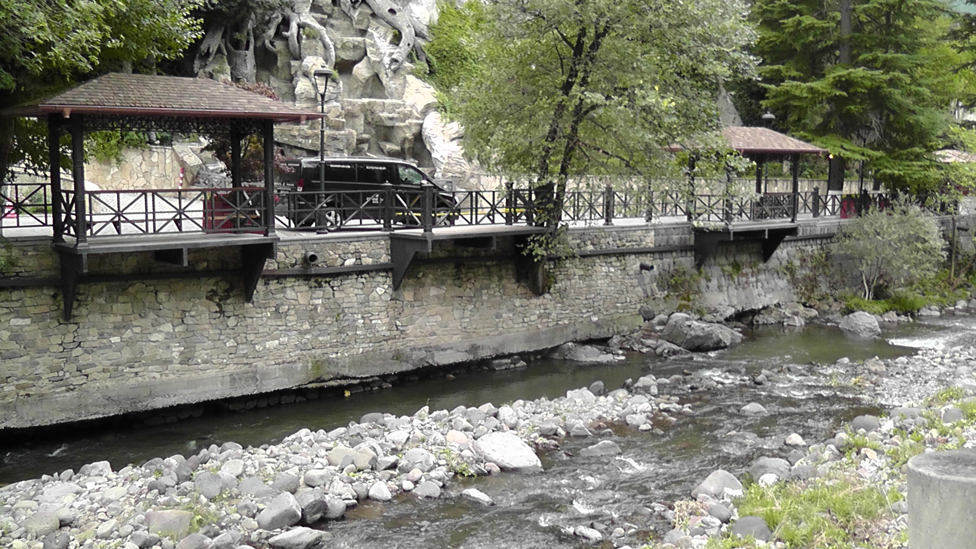 Вдоль реки есть подобие набережной, которая украшена беседками над рекой.