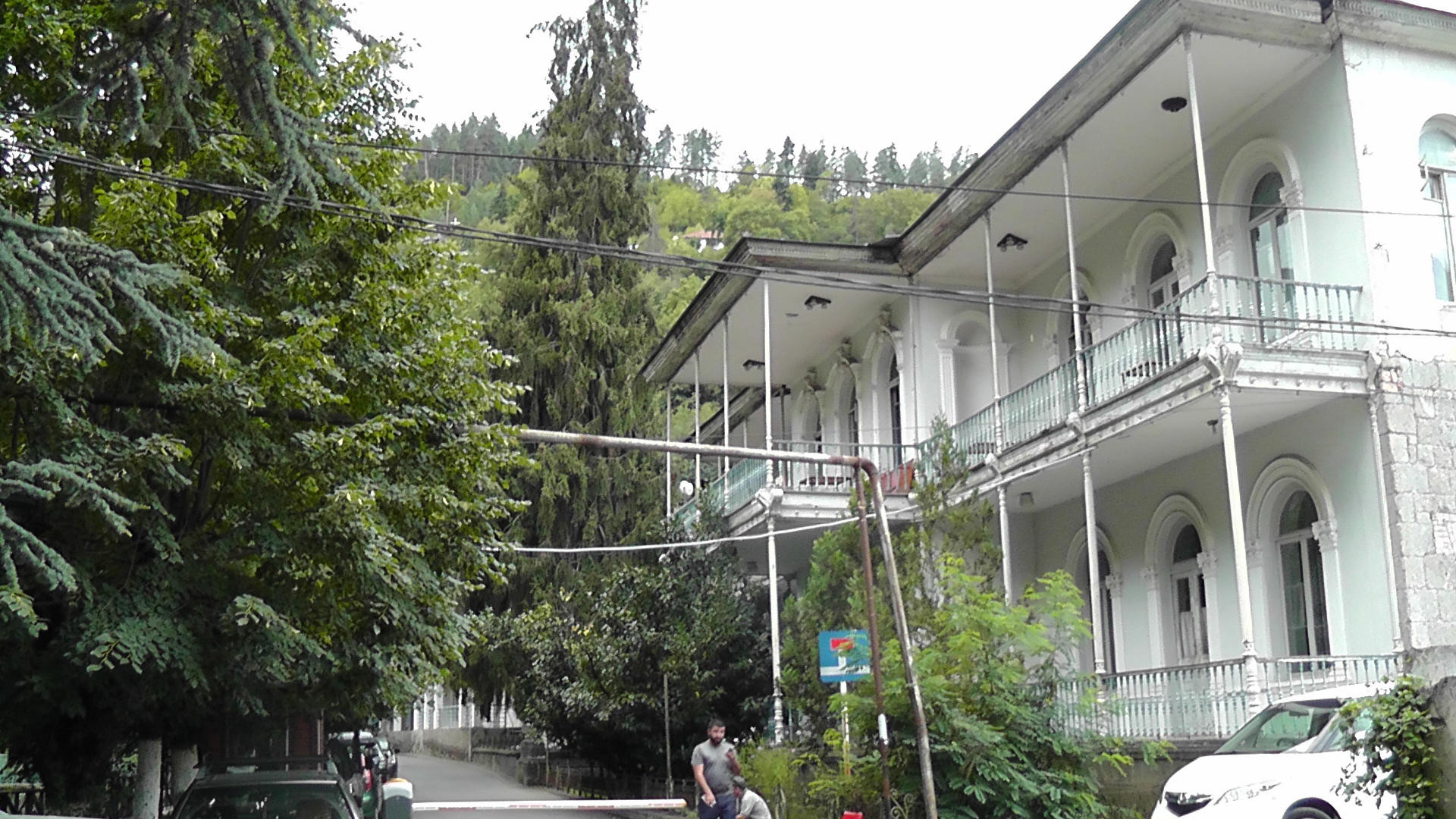Через дорогу от парка красивой здание с колоннами - железнодорожный вокзал города, который в мой приезд не работал из-за строгого ковид-карантина в Грузии. Здание красуется на всех открытках и является архитектурным памятником. На колонах навязчивая реклама ресторана», что находится прямо в здании жд вокзала.