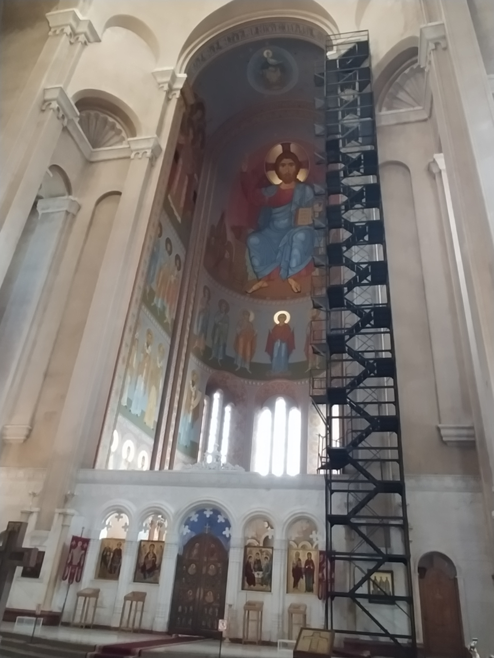 После длинного перехода и небольшого подъёма мы достигли центрального собора Грузии, который видно почти из любой точки Тбилиси: Цминда Самеба (Святая Троица). Подошли мы к нему немного сбоку, и сначала увидели часовню при соборе, настолько крупную, что мы её сначала приняли как раз за собор, поскольку она заслоняла храм. У входа стояла прислонённая к стене крышка гроба (видать, отпевали какого-то важного покойника, не у всякого последний путь проходит через главный храм страны), поэтому в часовню мы заходить не стали, обошли её и только тогда увидели Самебу. Да, собор очень большой и симпатичный.