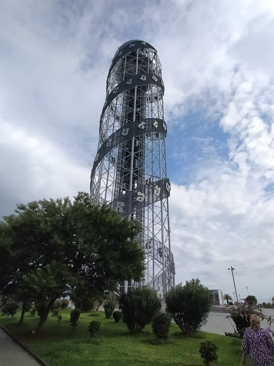 Мы прошли к башне грузинского алфавита. Она построена по проекту испанского архитектора. Его вдохновила местная письменность, эти округлые буковки как кудрявая шёрстка горного барашка. Эти буквы нанесены на две ленты, поднимающиеся по наружной поверхности башни и напоминающие структуру ДНК.