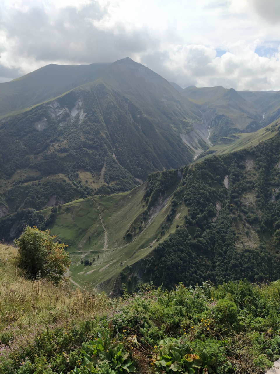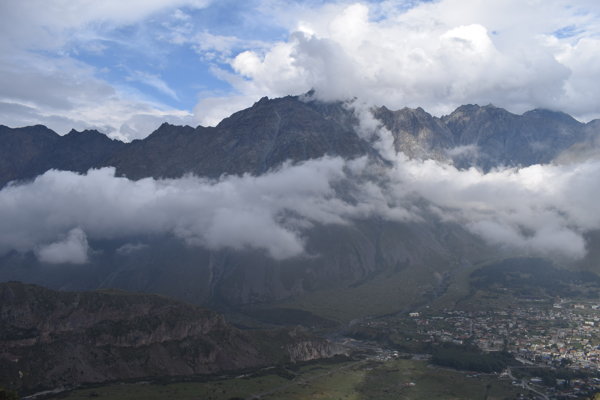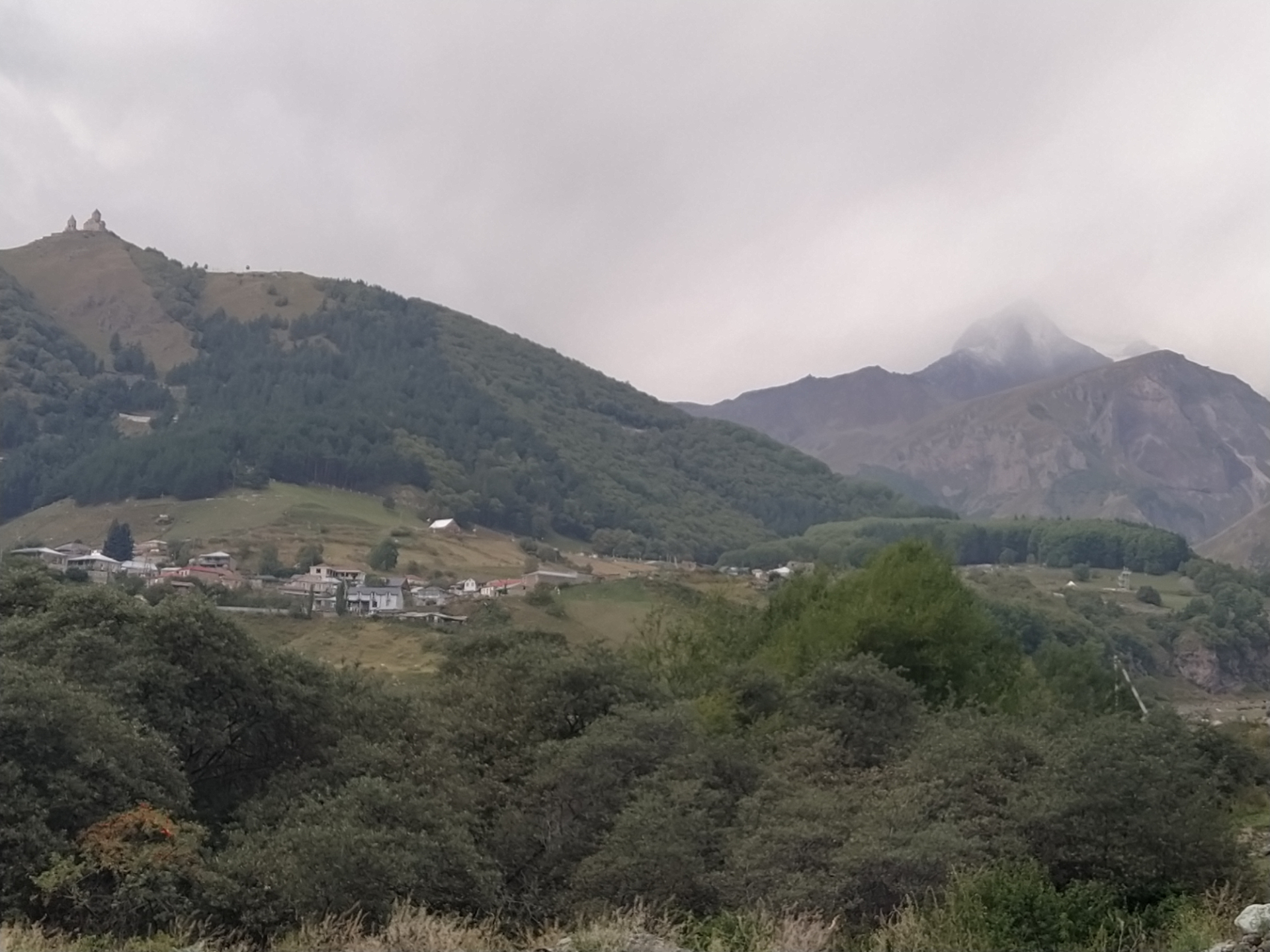 В принципе вид на Казбек оттуда действительно должен был быть лучше, но увы: самый кончик горы, самая его лакомая часть была скрыта тучками, которые даже бурчали раскатами грома.