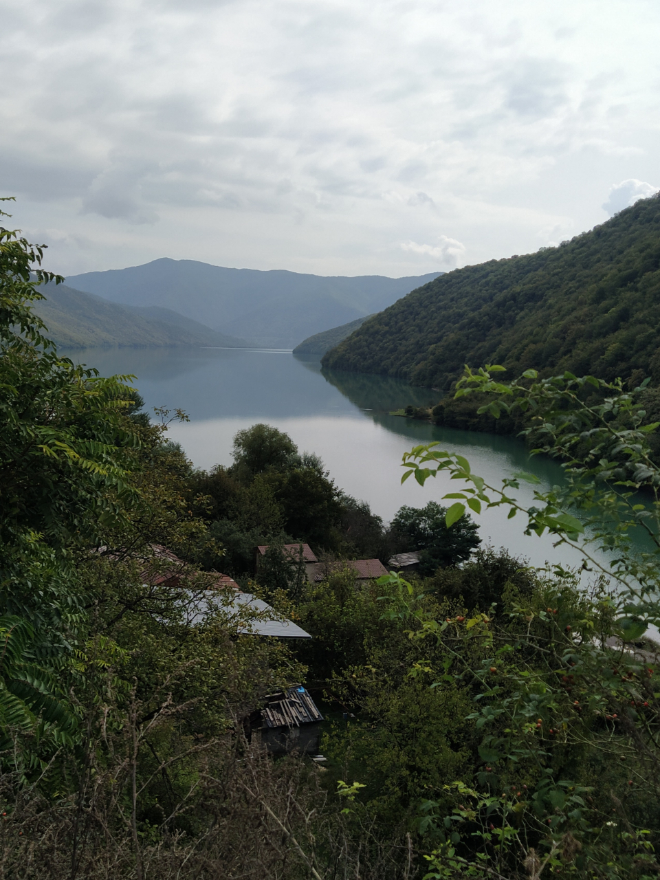 Весь путь проходил по Военно-Грузинской дороге, в настоящее время – единственной сухопутной ниточке, связывающей Россию и Грузию. Первая наша остановка была у Жинвальского водохранилища. Красивое место: водоём, выглядящий как горное озеро, обрамляется покрытыми хвойным лесом вершинами.