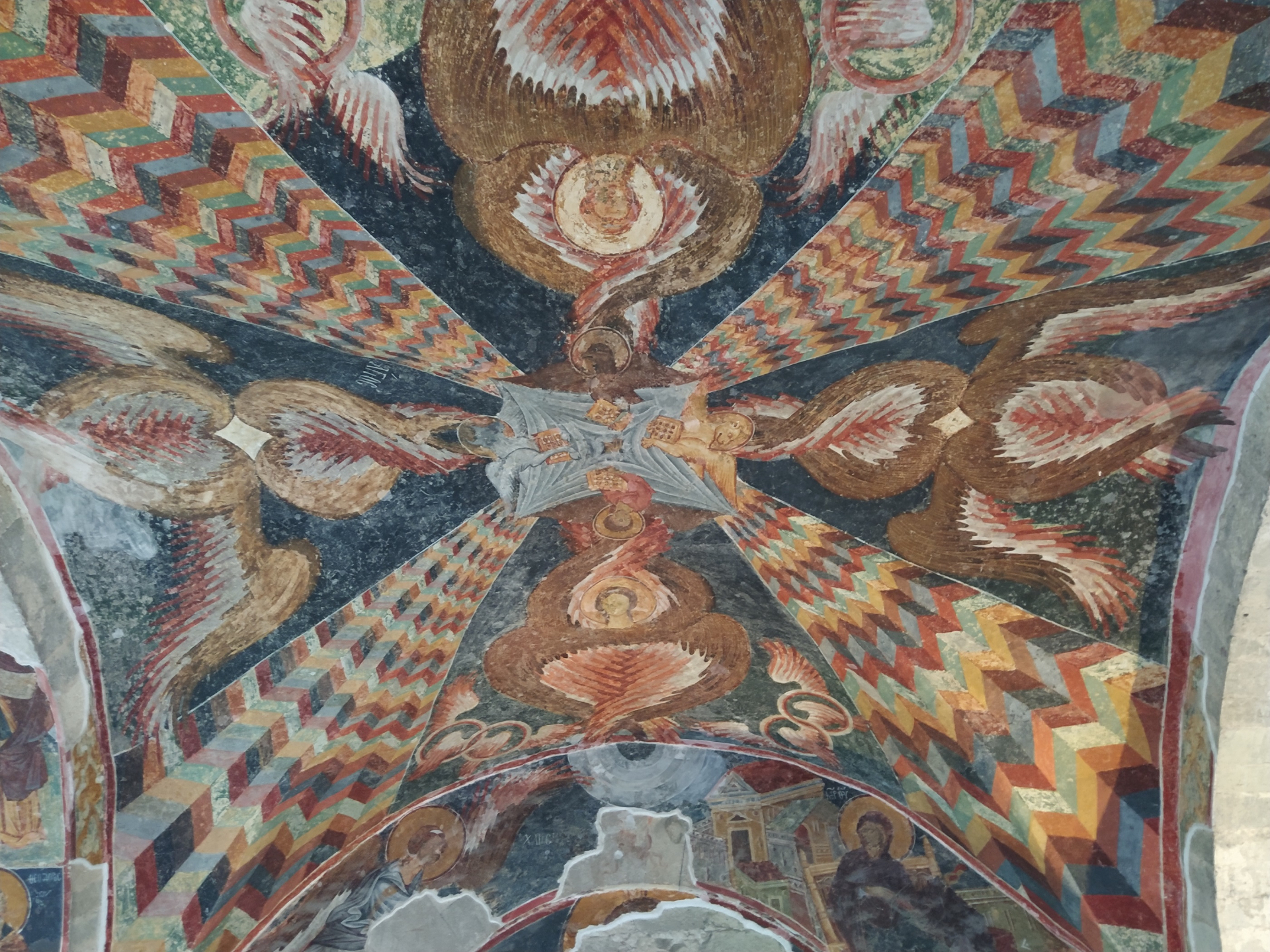 Потом мы посмотрели на панораму местности со смотровой площадки. Современный провинциальный город, глазу зацепиться не за что, только несколько сот метров крепостной стены да большая строящаяся мечеть в центре. Посмотрели и поехали к бывшей главной церкви Трапезундской империи, а нынче мечети Айя-Софья. В отличие от своей стамбульской тёзки эта древняя церковь-мечеть совсем небольшая, примерно как ДК в райцентре. История её полна метаморфоз: сначала турки переделали её в мечеть (но что удивительно, не пристроили минаретов), потом при Кемале Ататюрке превратили в музей и даже освободили от штукатурки старые замазанные христианские настенные росписи; наконец, в последние годы снова отдали мусульманам, а открытые росписи оставили только в боковых помещениях, а на куполе стыдливо прикрыли белыми зонтами, да ещё и закрепили наверху мощные лампы, которые слепят тех, кто хотел бы посмотреть хоть краешки этих фресок из отдалённых углов храма. Надо ли говорить, что даже на открытых для обозрения картинах лики святых стёрты до штукатурки ещё в старину, ибо низзя! Харам!