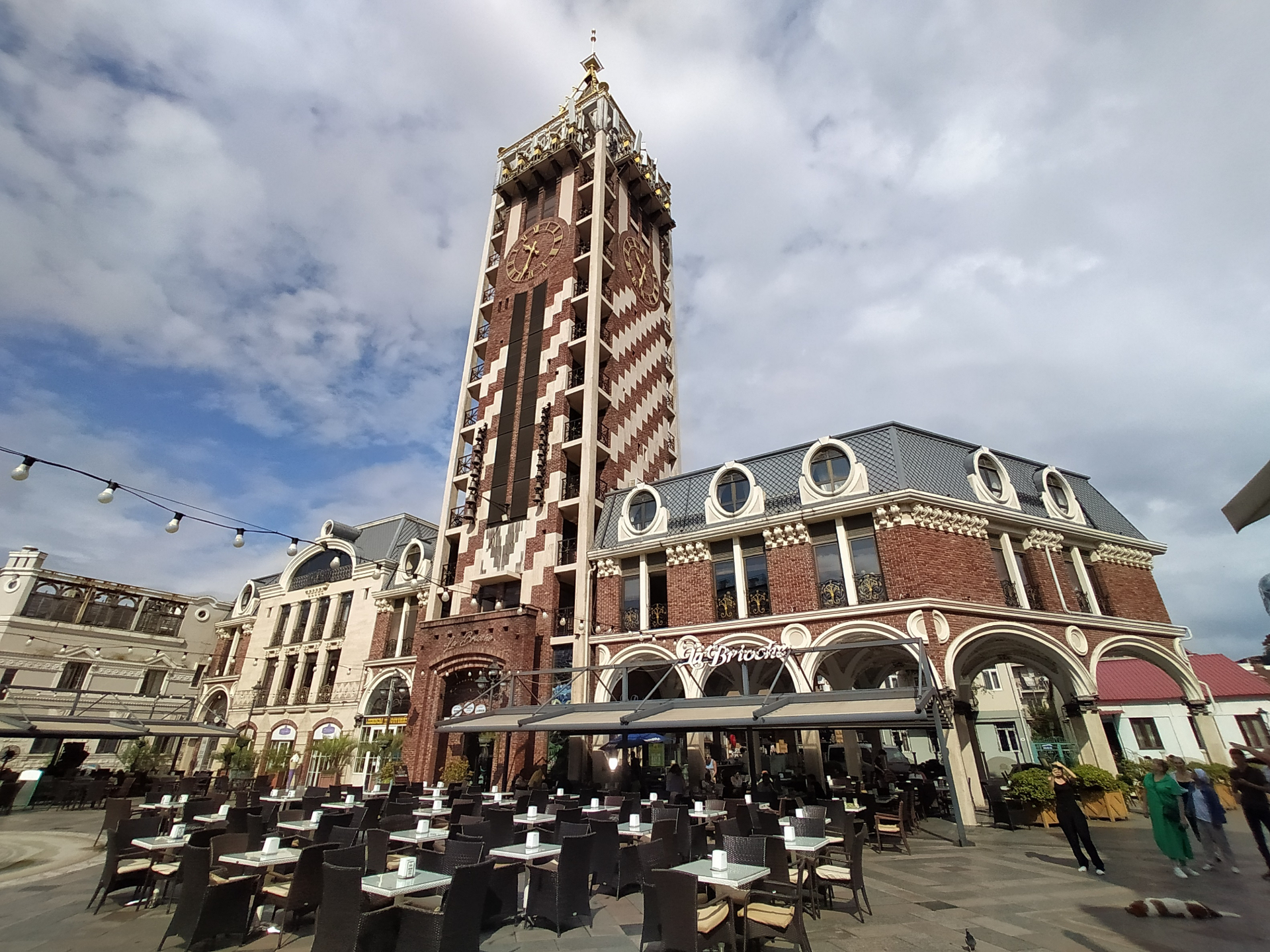 Теперь мы идём на площадь Пьяцца. Собственно, «пьяцца» по-итальянски и означает «площадь», так что получилось немного тавтологии. Но это неважно. Важно, что этот новострой очень точно и с хорошим вкусом передаёт ауру итальянского центра города: дома в итальянском стиле, образующие каре, стилизованная под старину высокая башня с часами,