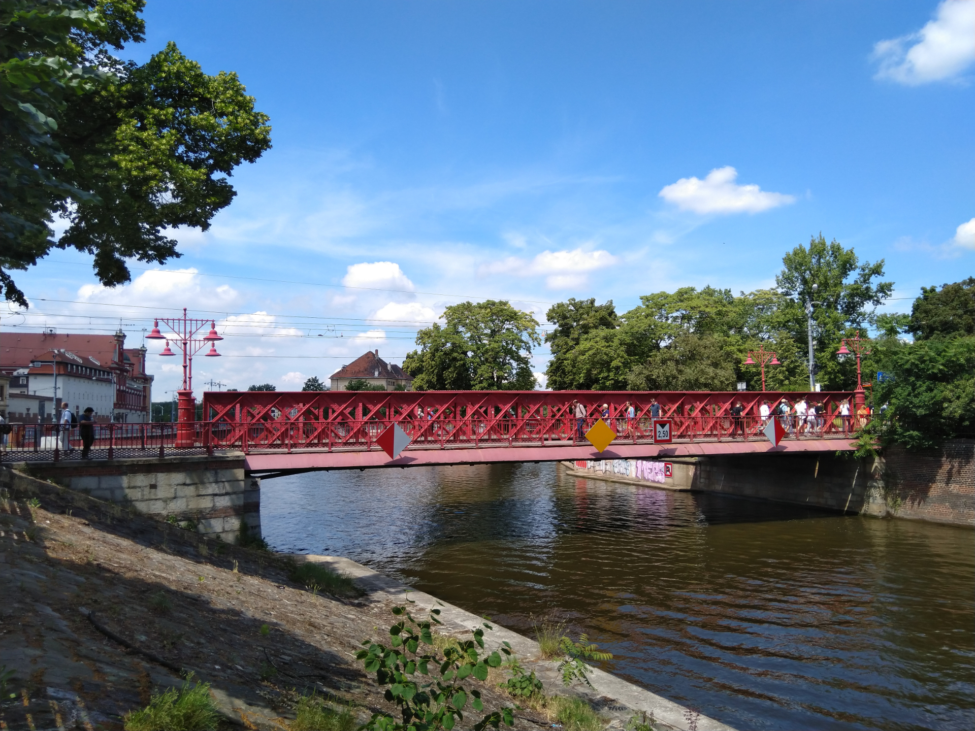 Перед историческим центром мост, ведущий на остров Пяски, по цвету Красный. Сейчас мосты во Вроцлаве имеют свои названия, но раньше их различали именно по цветам. Так было проще указывать направления. Но официально он называется по названию острова – Пясковый. Как пройти на Тумский остров? Нужно пройти красный мост, а потом – зеленый😊 Название Пясковый закрепилось за мостом из-за рядом расположенного костела «Костел Пани Марии на Пясках».