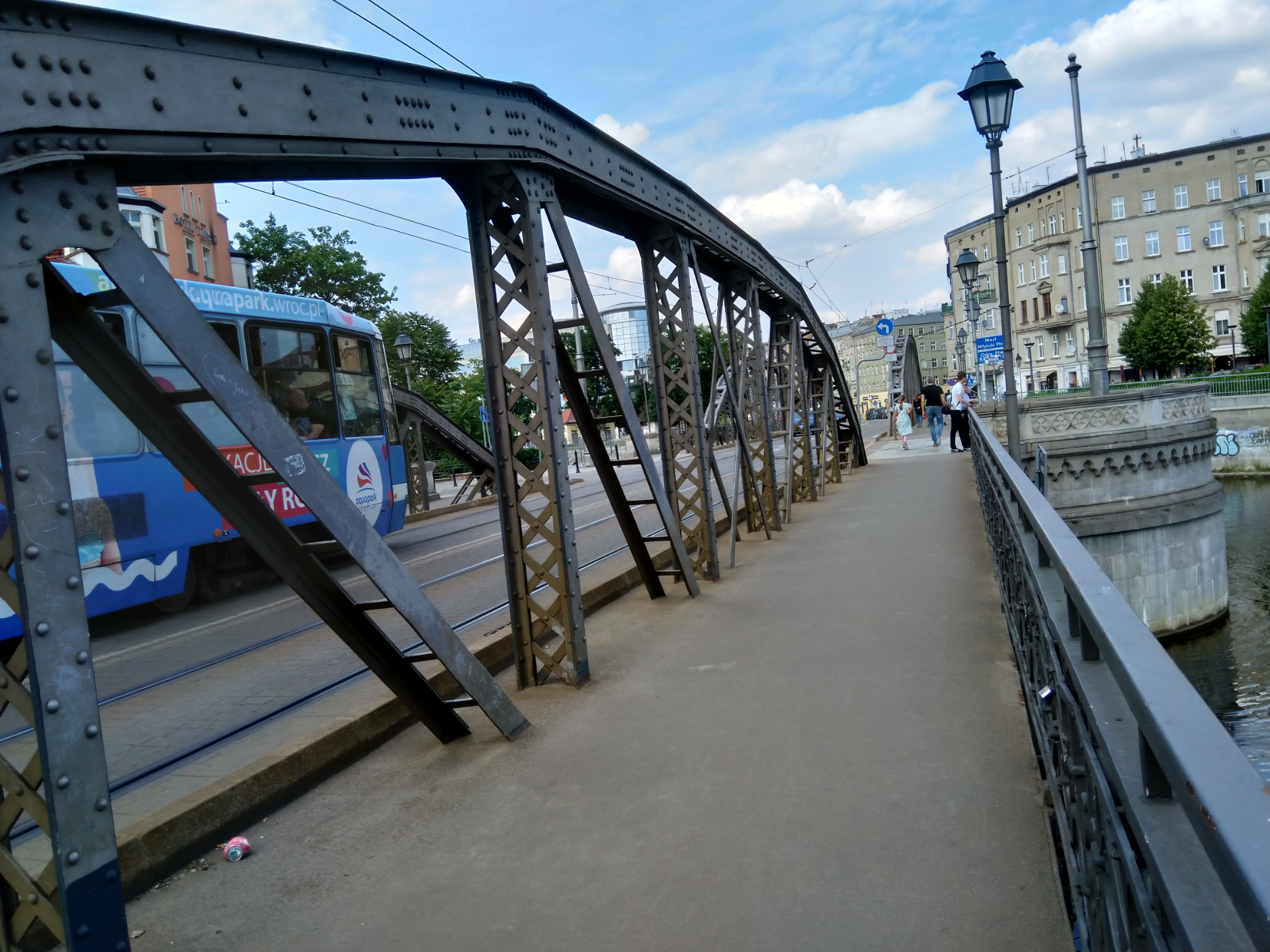 Как ни приятно летать, надо выходить и идти ножками. Новый мостик совсем не эфирный, напротив, капитально-каменный. Необарочный Олавский мост, как осколок прошлого, зацепившийся за островки Одры. Арочный мост с железными конструкциями, что для своего времени - построен в 1883 году, было инновационным решением.