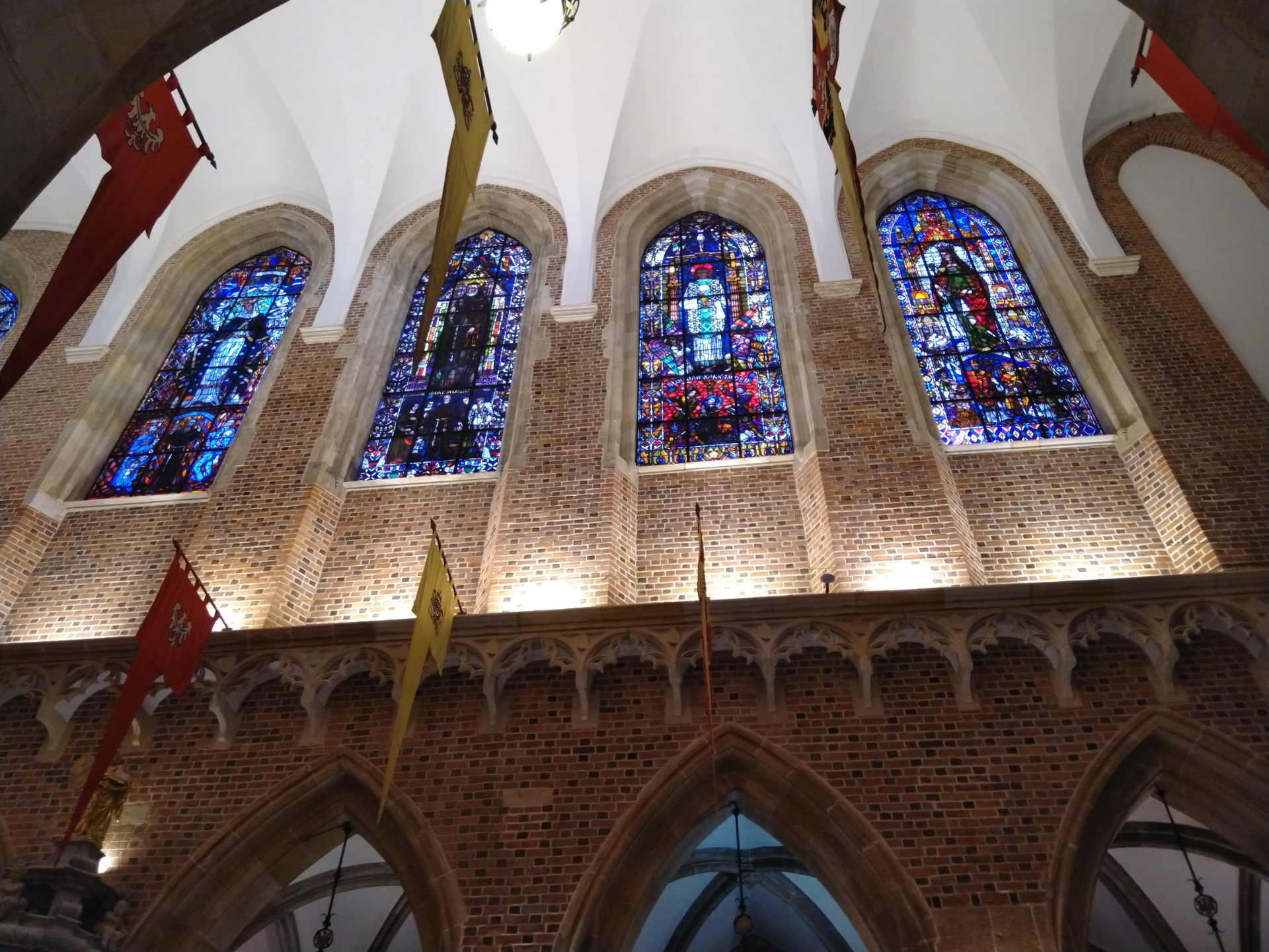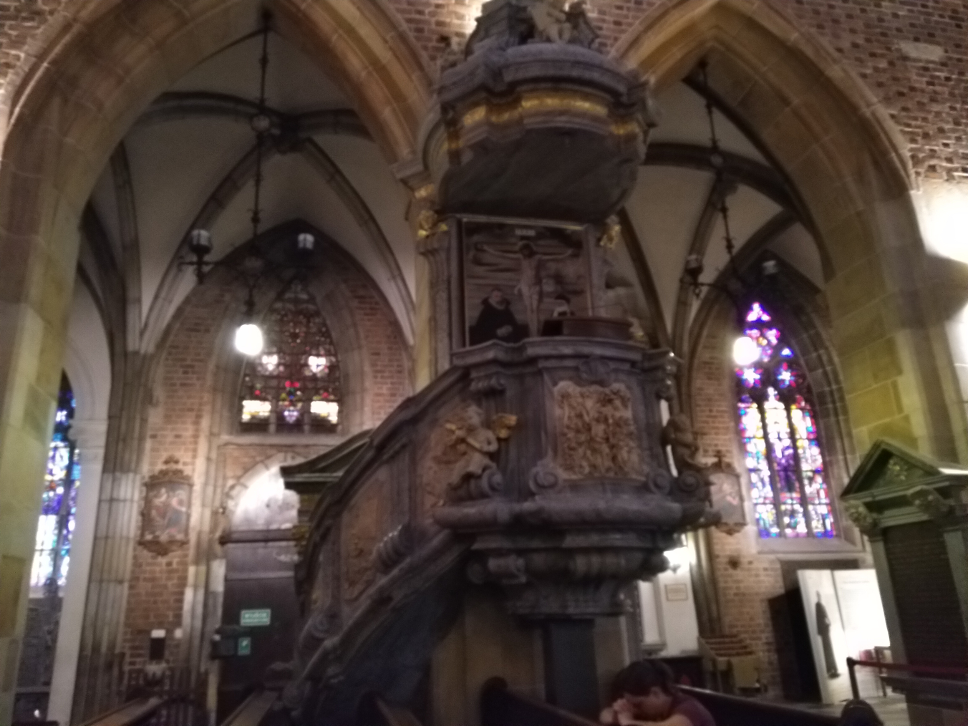 Где-то снаружи есть интересные детали. Уцелевший ренессансный водосток в виде дракона с открытой пастью. Или выступающую из стены на южной стороне голову мужчины с открытым ртом. Из-за огромности здания, лично этого не увидела, поверим интернету. Про торчащую голову есть легенда, как бедный ученик ювелира, влюбившись в его дочь, чин-по-чину попросил ее руки. Но не вышел cам чином. Отец поставил условие: согласится на брак в том случае, если молодой человек откроет свое дело. Юноша исколесил много дорог, брался за любое дело, но капитала не сколотил. Случайно попав в шайку разбойников, тоже стал промышлять «на больших дорогах», и заполнил наконец сундук драгоценностями. Вернувшись домой, вновь посватался и получил «добро». Когда же ювелир узнал, каким образом было приобретено богатство, взял свое слово обратно. Разъярённый жених поджег дом несостоявшегося тестя. И чтобы убедиться, как знатно пылает, влез в собор и высунул голову в слуховое окошко. На это последовала незамедлительная кара Небес. Стена упала прямо на шею, голова окаменела.
