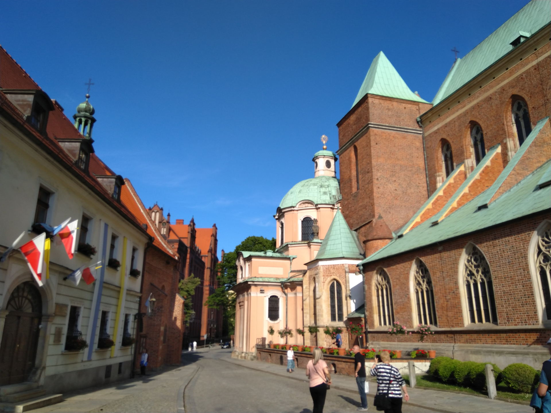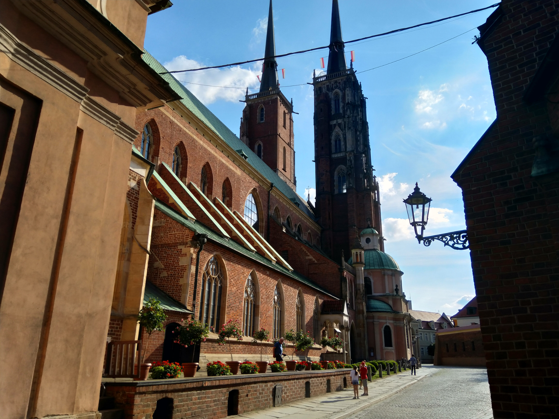 На остров можно попасть по мостам над Одрой. Перешли сначала по красному Пясковому мосту, потом обогнули остров Пясек и добрались до зеленого Тумского моста. Первый мост появился в XI веке, конечно, деревянный, с XII-го он был границей костельной юрисдикции, которая не подчинялась ни княжеским, ни городским правам. В связи с этим на острове могли спокойно укрываться преступники. Служил своего рода границей между территориями, подчиняющимся светской власти и религиозной. Для этого был установлен специальный столб с двумя гербами, чешским и епископским. Так же стоят статуи святых Ядвиги и Иоанна Крестителя.