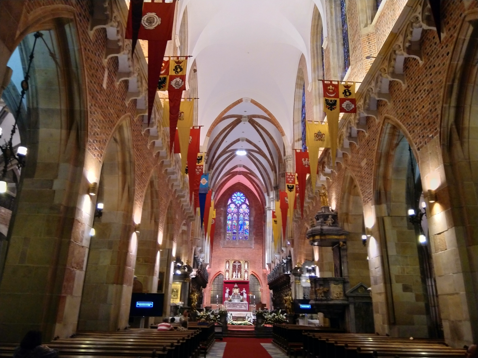Первым встречается слева по ходе от моста большой костел Святого Креста и Святого Варфоломея. Этот собор уникален тем, что выглядит он как одна церковь, а вмещает в себя сразу две. По легенде один богатый горожанин решил построить на Тумском острове костел в честь Святого Варфоломея. Именно молитвы к этому святому помогли вылечиться его детям. Он выбрал место, начал обдумывать архитектурное решение, а в это время на этом самом месте началось другое строительство. Оказалось, местному священнику приснился сон, что именно здесь он должен построить Костел в честь Святого Креста. Оба сумели договорить, решив строить оба костела прямо на этом месте. Если приглядеться к входным дверям за спиной памятника Яну Непомуцкому, то дверь с высокими ступеньками веден в костел Св. Креста. Дверь слева от ступенек - в костел Св.Варфоломея. Костелы находятся один над другим. У них два священника, два органа и свои паствы.