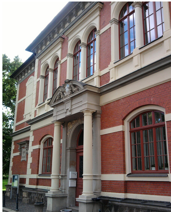 Сначала все-таки город рассмотрели, замок - на десерт. Через центр городка протянулась улица, которая считалась главным променадом в Глаухау.с торговыми и ресторанными заведениями по обе стороны. Открывает ее вот такой удивительный краснокирпичный дом, скорее на сказочный ларец похожий. Здание Рейхспочты и Телеграфа, построенное 1892—1893 гг. пережило войны и снова украшением городка является.