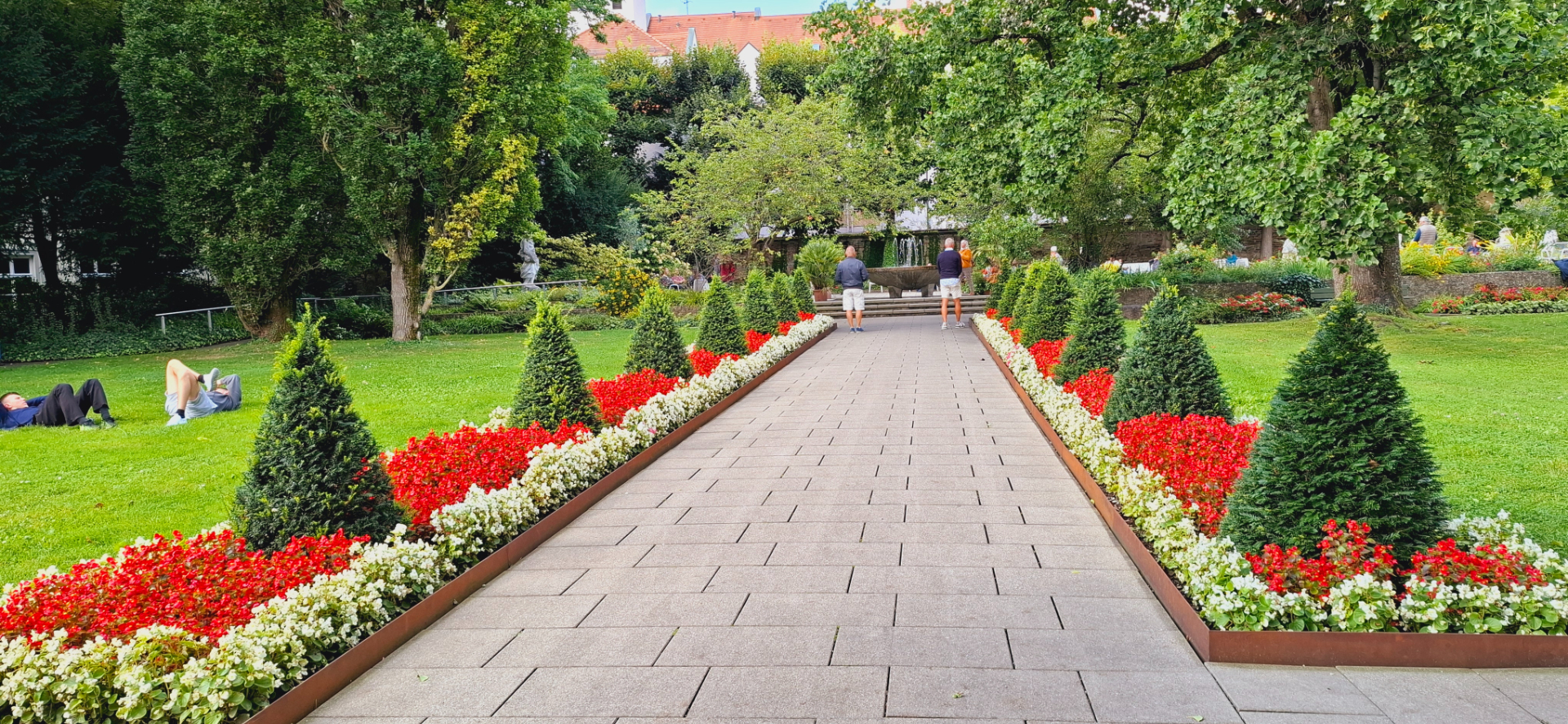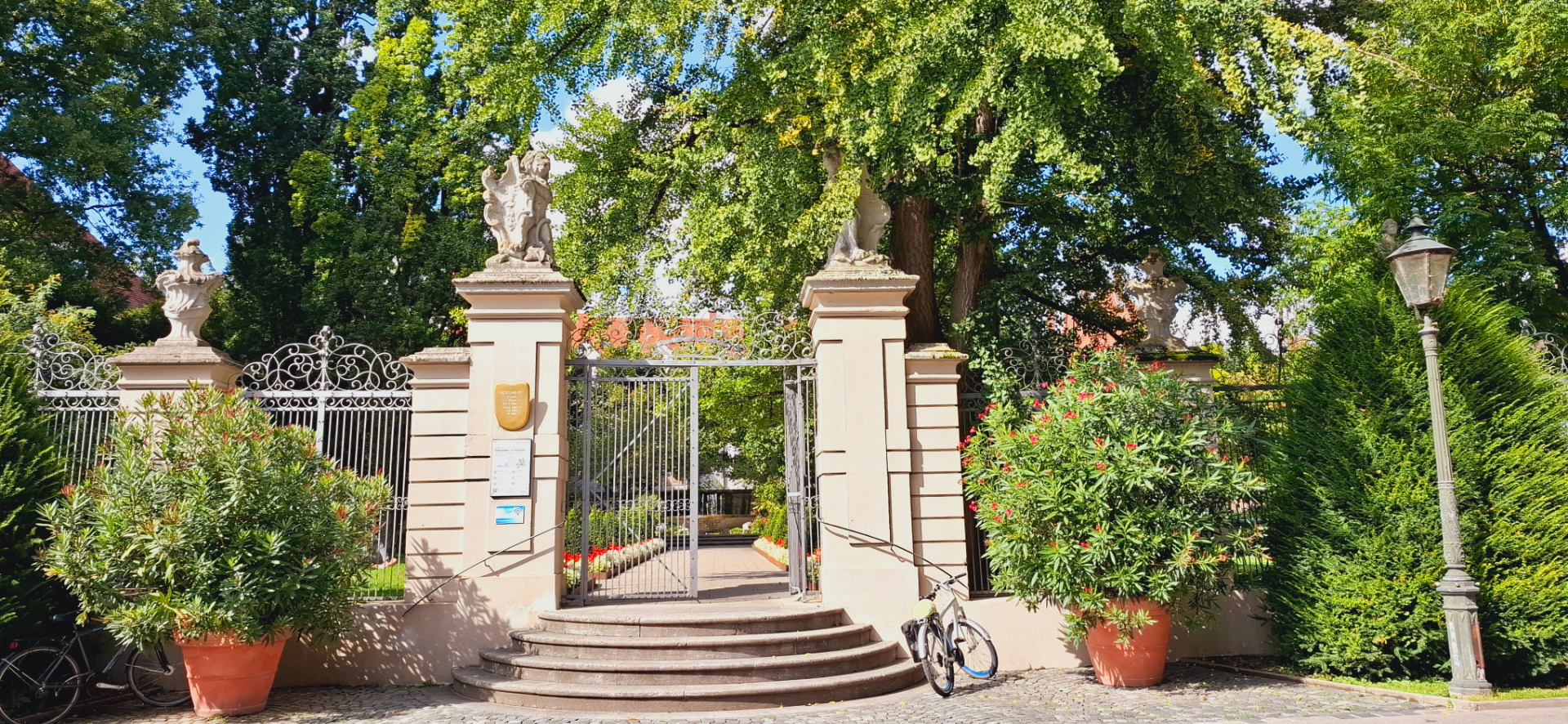 Сейчас мне интересен «придворный сад Хофгартен» - Hofgarten. Надо пройти епархиальный дворец через подъезд под балконом. Напротив искомый садик, вход в него огорожен ажурной оградой.