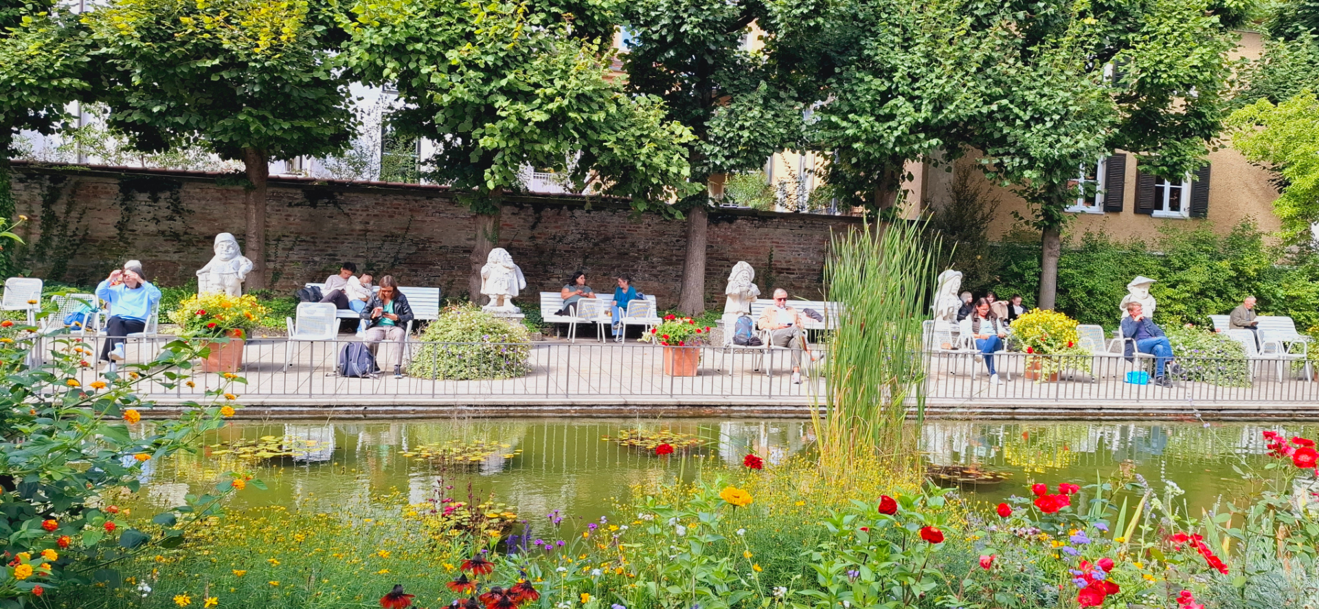 Цветы, кусты гибискуса и глицинии, живые изгороди и пирамиды, декоративные рыбы в пруду, скамейки для отдыха и скульптуры восстановили обстановку XVIII и XIX веков. Ухоженный садик с маленьким прудиком, фонтаном, цветочными клумбами весь заполнен людьми. Скверик любимое место отдыха местных жителей.