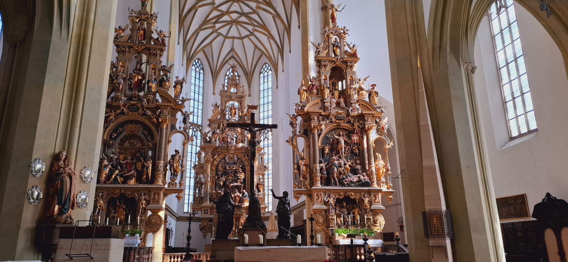 Внутренний интерьер поражает… высотой. Под этими сводами пел когда-то в церковном хоре маленький Леопольд Моцарт - будущий отец Вольфганга Амадея Моцарта. По обе стороны от престола высоченные композиции, уходящие ввысь. Высота алтаря составляет от 21 до 23,5 метров. Бесценная часть храмового декора - алтарные картины жития Богоматери, созданные в 1493 году Гансом Гольбейном Старшим.