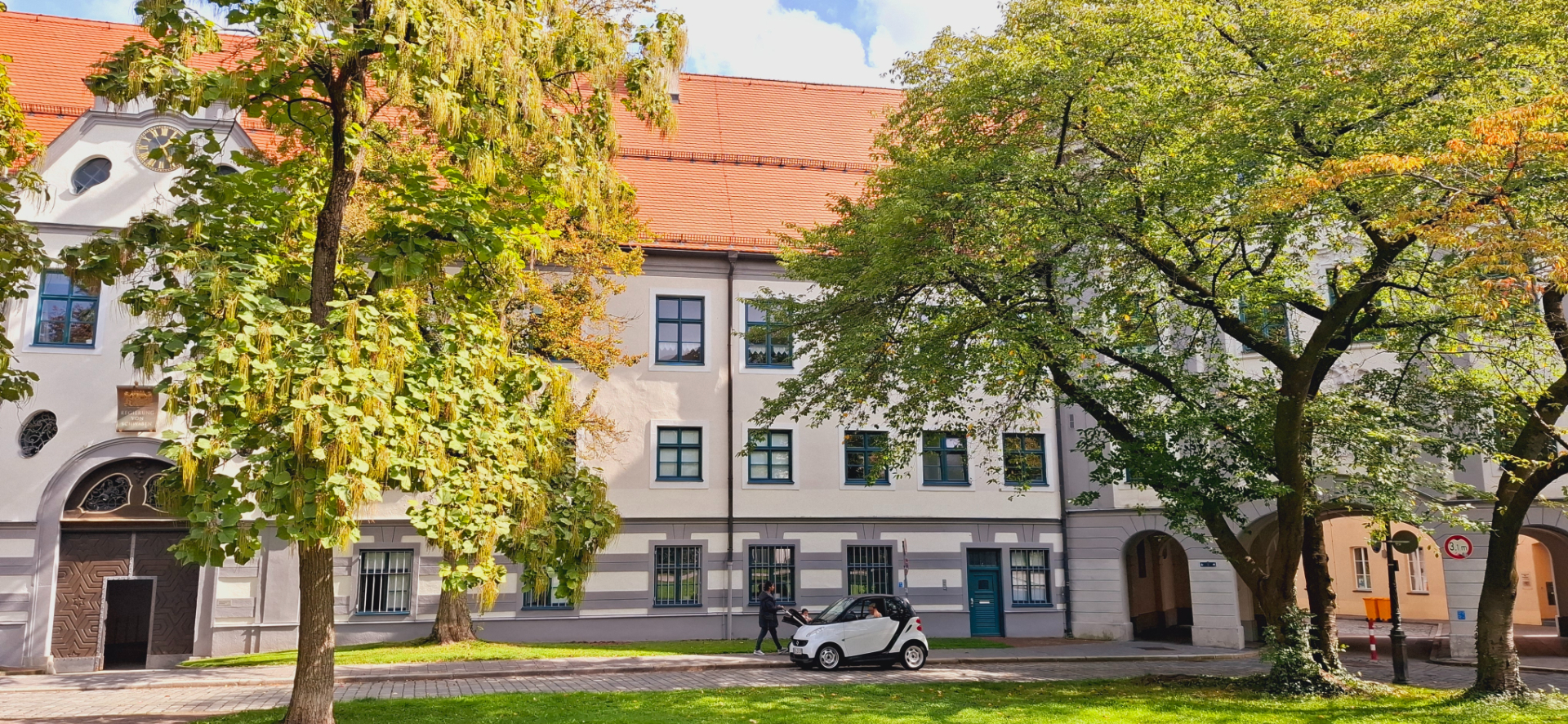 В средневековом Аугсбурге, как и в большинстве европейских городов, территорию внутри городских стен занимали дома, дворцы знати и богатые храмы. За парком Фронхоф около собора Св.Марии находится бывшая епархиальная резиденция, выстроена более трех веков назад. Резиденция архиепископа приобрела свой нынешний вид в середине XVIII века. Долгое время она был домом для аугсбургского епископа, потом отошла Швабии. Когда 18-м веке весь комплекс значительно расширили и оформили в стиле позднего барокко, то вписали в угол и средневековую башню-капеллу. Над главным входом интересный балкон, который построили в честь визита Папы римского 1782 г. в Аугсбург.