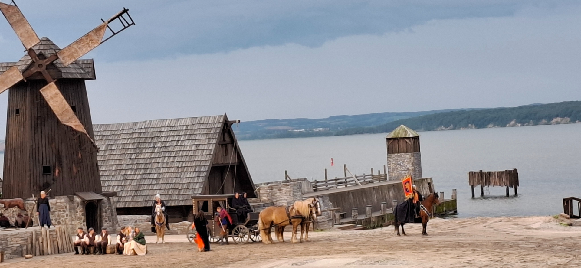 И «выкидывали» разное: то промчатся всадники за каретой, то корабль -настоящий, проплывет заливу Ralswiek. Пушки стреляли, что—то взрывалось, рубили на гильотине голову и в конце - фейейверк.