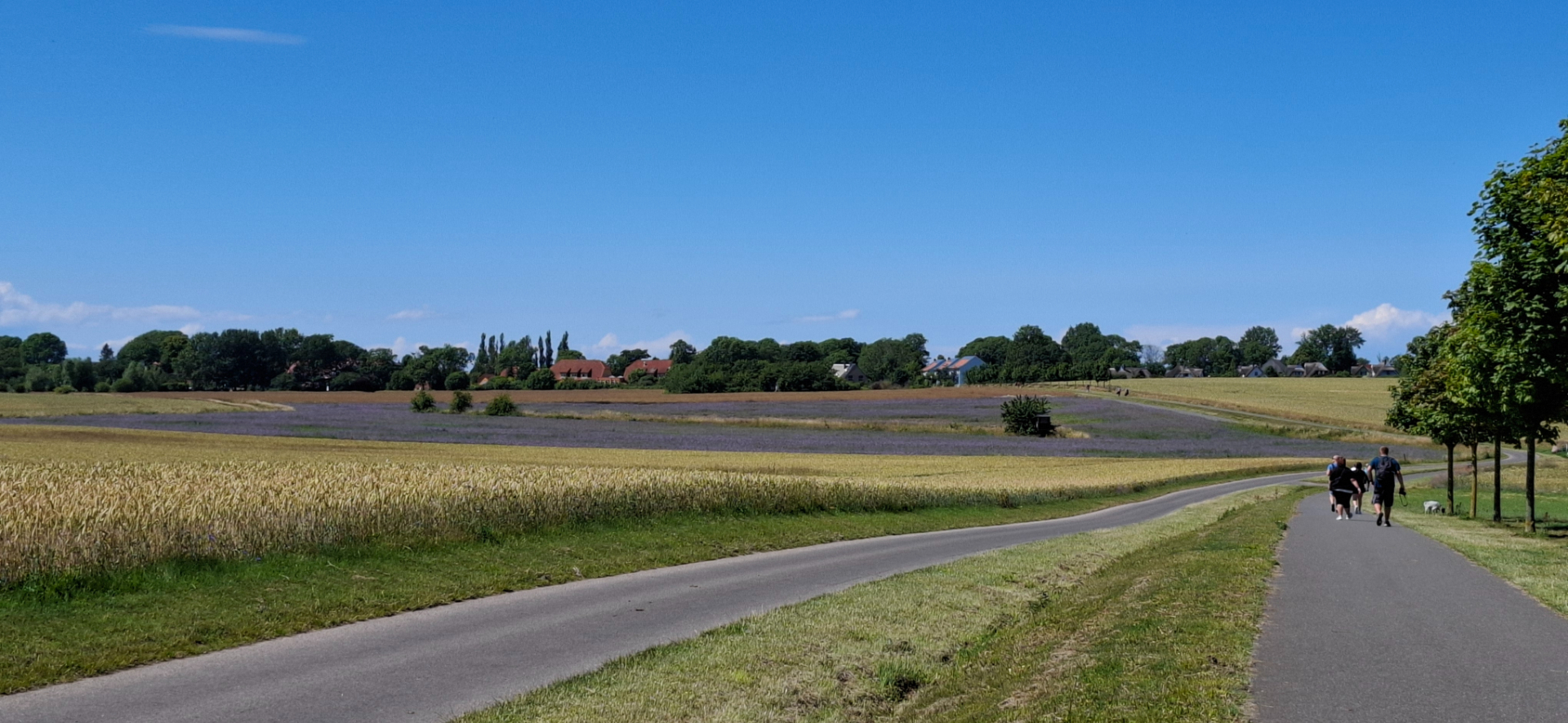 Дальше путь между полями пшеницы с увесистыми колосьями. За ними появились силуэты зданий, что и есть цель маршрута.