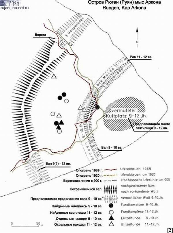 Теперь оно единственное славянское укрепление такого рода в Германии, где по сию пору в море обрываются белые скалы. Всего 23 славянских городища на Руе – Рюгене. На Арконе оно представляет собой двойные кольцеобразные валы высотой 13 м протяженностью 300 на 350 м на 45-метровом высоком берегу мыса. В IX веке в крепости возвели храм бога части западных славян Святовита. «Город Аркона лежит на вершине высокой скалы; с севера, востока и юга огражден природною защитою. С западной стороны защищает его высокая насыпь в 50 локтей… Посреди города лежит открытая площадь, на которой возвышается деревянный храм, прекрасной работы».