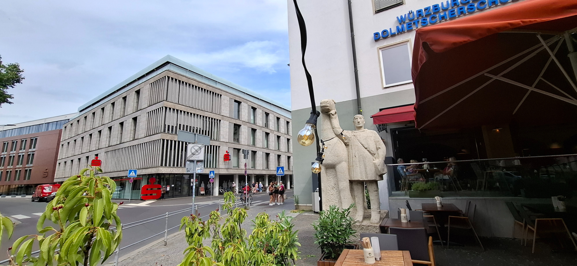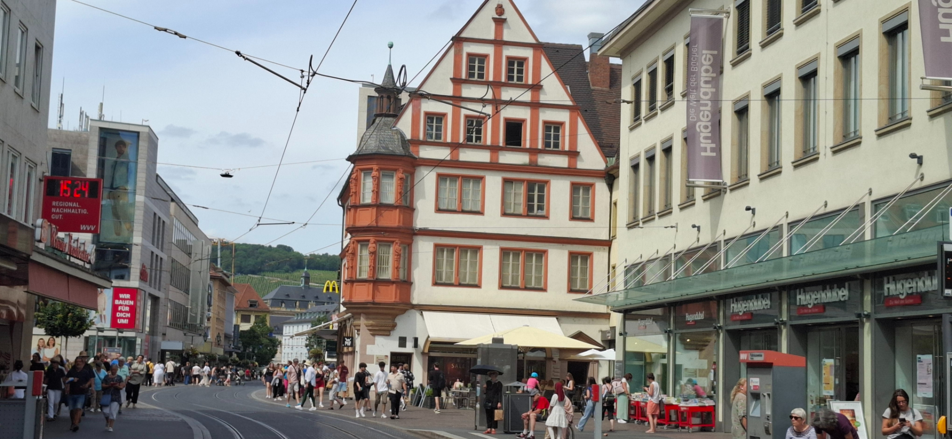 От Старого моста в центр города ведет улица Домштрассе, которая заканчивается у Собора Святого Килиана. Она всегда заполнена людьми, как главная туристическая артерия города. И в старину она была оживленной, тут находились многочисленные лавочки, мастерские ремесленников, магазины.