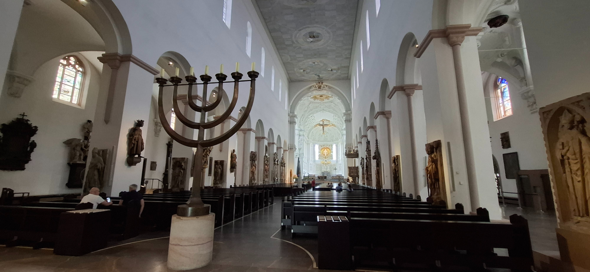Сразу на входе в молельный зал видим каменный Семисвечник или «семираменный канделябр», что является уникальным элементом церковного интерьера. Он есть в некоторых других крупных храмах Европы. Он подчеркивает связь христианской церкви с библейскими традициями, является древнейшим символом, восходящим к иудаизму и раннему христианству. Каждый из семи светильников может символизировать семь даров Святого Духа или семь дней сотворения мира.