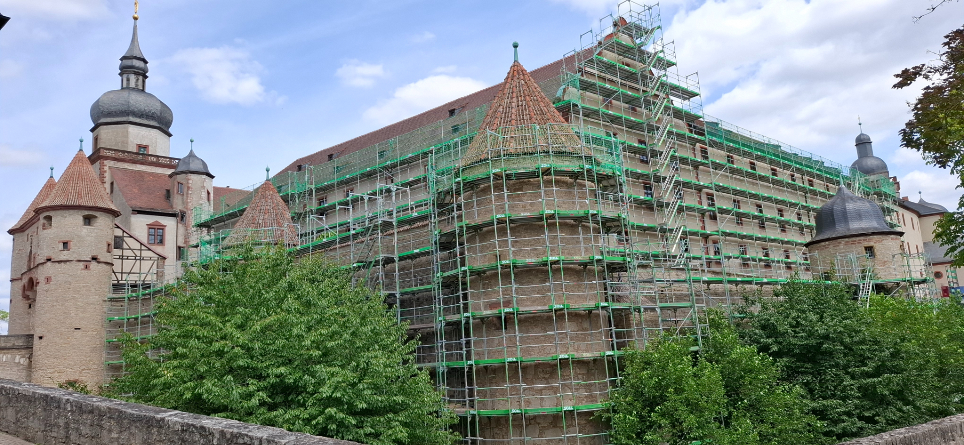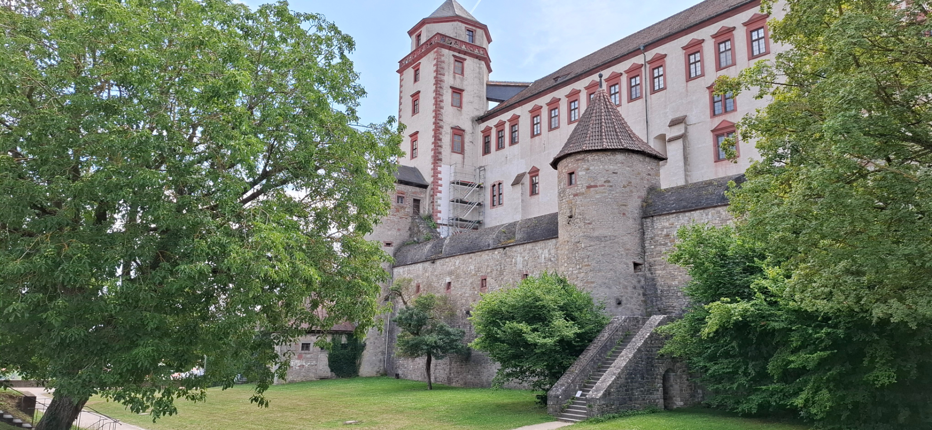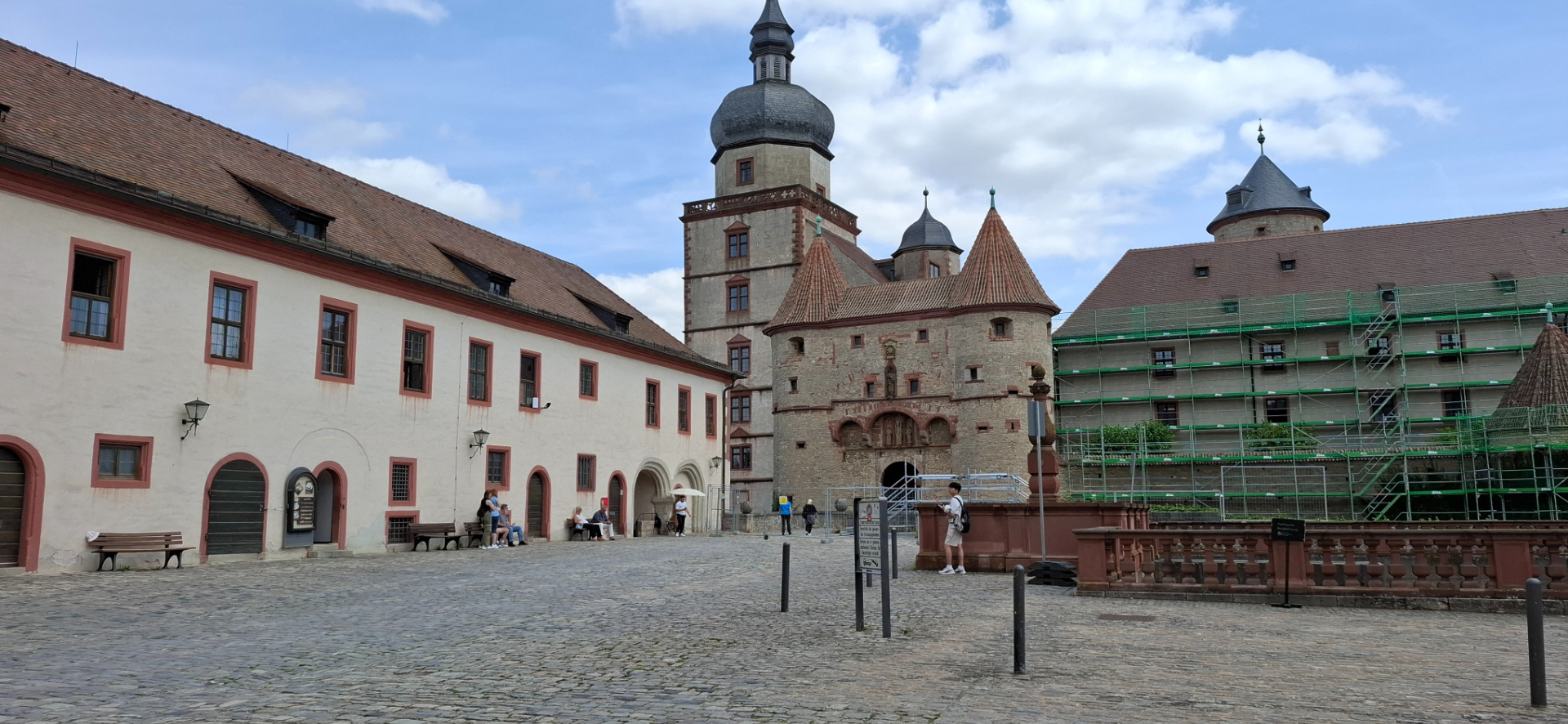 Видимый от реки прямоугольный в плане Fürstenbau с четырьмя крыльями. Три из его четырех углов отмечены башнями -по часовой стрелке от северо-запада: Kiliansturm, Marienturm и Randersackererturm. Они относятся к восстановлению замка в начале 17-го века. Одна из высоких башен замка – башня Бергфрида, подобна французскому донжону. Ее не видно из-за стен, потому что она стоит прямо посередине епископского двора. Только черная крыша с определенного ракурса угадывается. Таковым и должно быть ее положение, как последнего оплота обороняющихся. Bergfried был первоначально известен как Mittlerer Turm или Wartturm. Каноническая форма двух цилиндров, помещенных друг на друге, всегда сохранялась. Но пропорции здания были изменены в 13-м веке, размер окон увеличился. Куполообразная крыша и Echterchor были добавлены во времена епископа Эчтера.