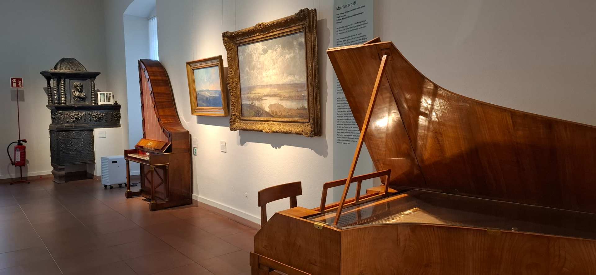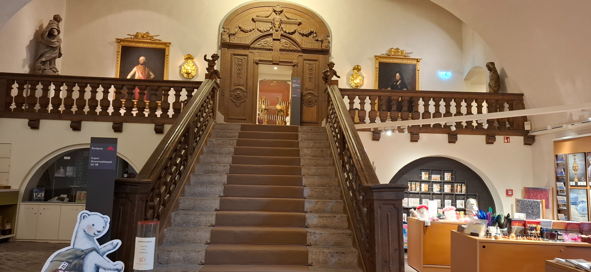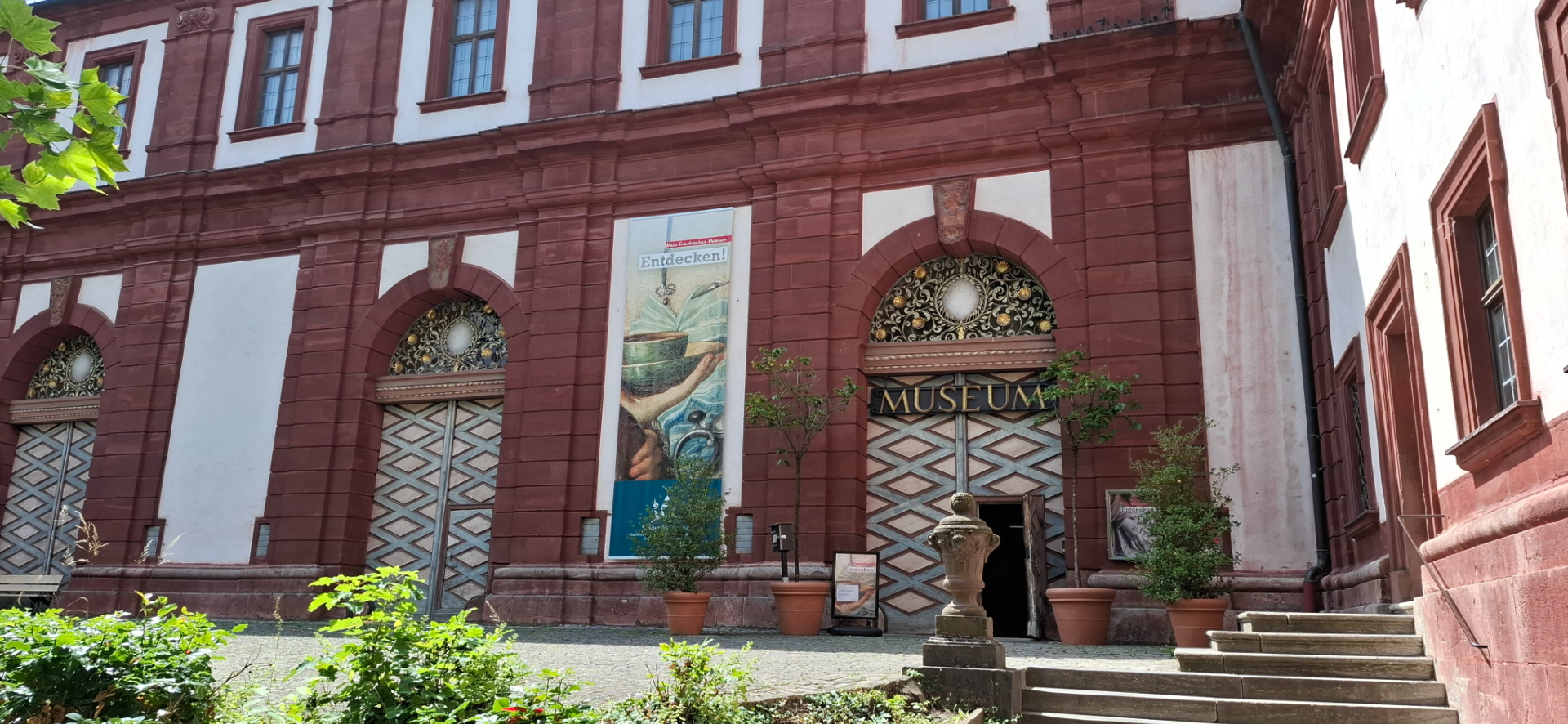 Он расположен не в одном доме, занимает примыкающий «Дворец Фюрстен», помещения для гарнизона, бывшие конюшни. С 1946 происходило восстановление барочного Zeughaus -склада оружия, первоначально 1702-1712 гг. постройки, но разрушенным в 1866 и 1945 годах. Франконский музей Музей «Майна и Франконии» находится в этом дании бывшего склада оружия. Когда восстановили, скорее построили заново, Echterbastei -бастион Эхтера, музей расширился в эту часть крепости. От кассы широкая лестница наверх.