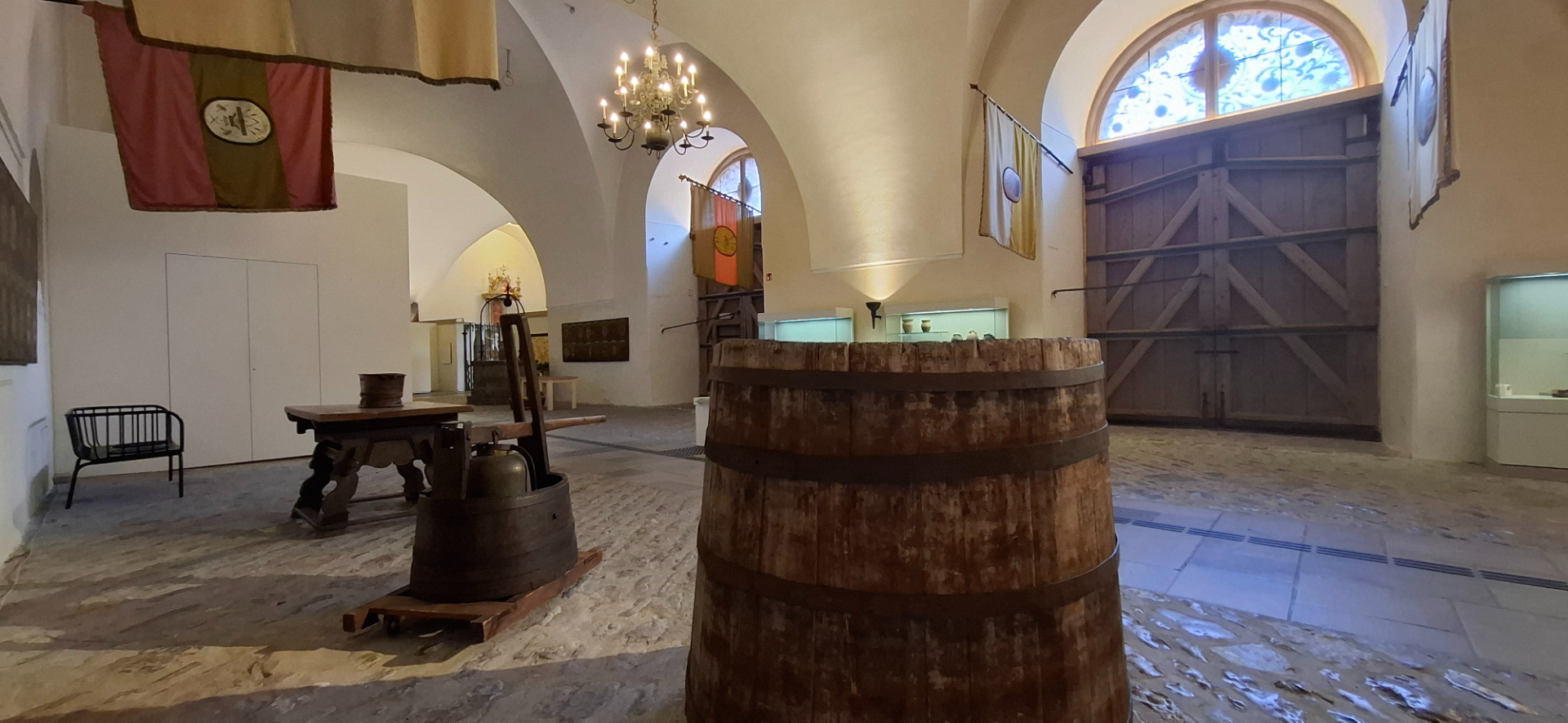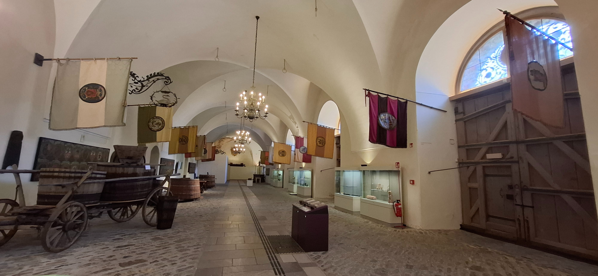 Маршрут по зданиям музей круговой. Возвращаться к холлу с кассами через бывшие конюшни, где представлены предметы быта, выполненные мастерами народных промыслов, коллекция оружия, как средневекового, так и более позднего вооружения, например, образцы артиллерии. Среди предметов быта посетители могут увидеть интересные экспонаты – давильные прессы, с помощью которых в старину получали сырье для изготовления вина.
