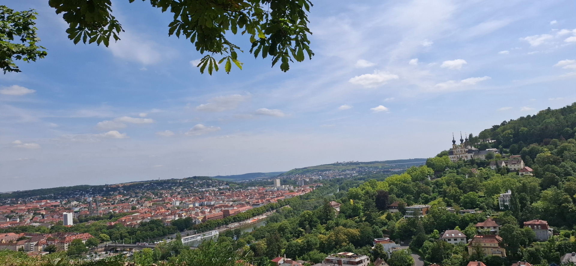 Из главных храмов видны сверху от моста: влево – красно-белая Мариенкапелле, почти рядом отличающийся черным куполом Ноймюнстер. И четыре бело-красные башни собора Св.Килиана возвышаются в центре.
