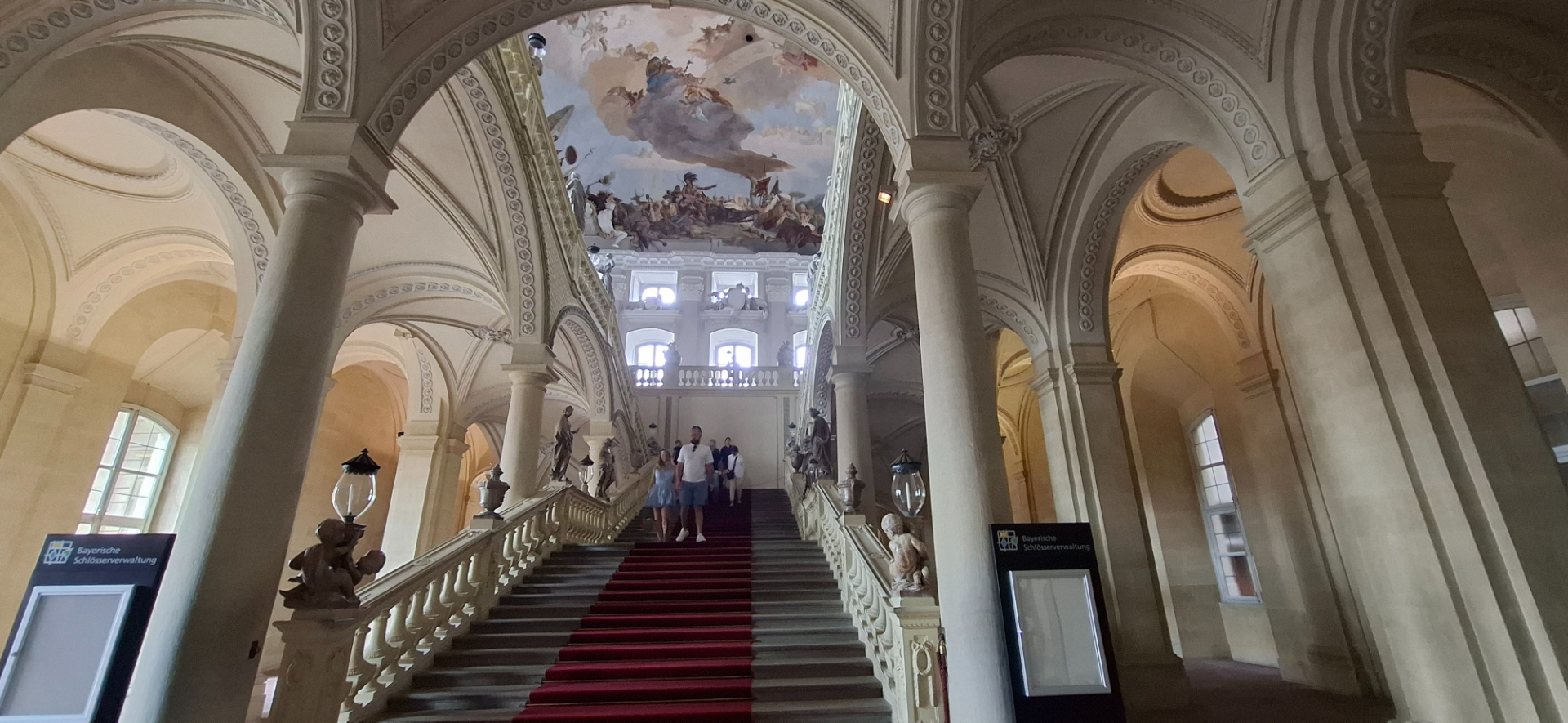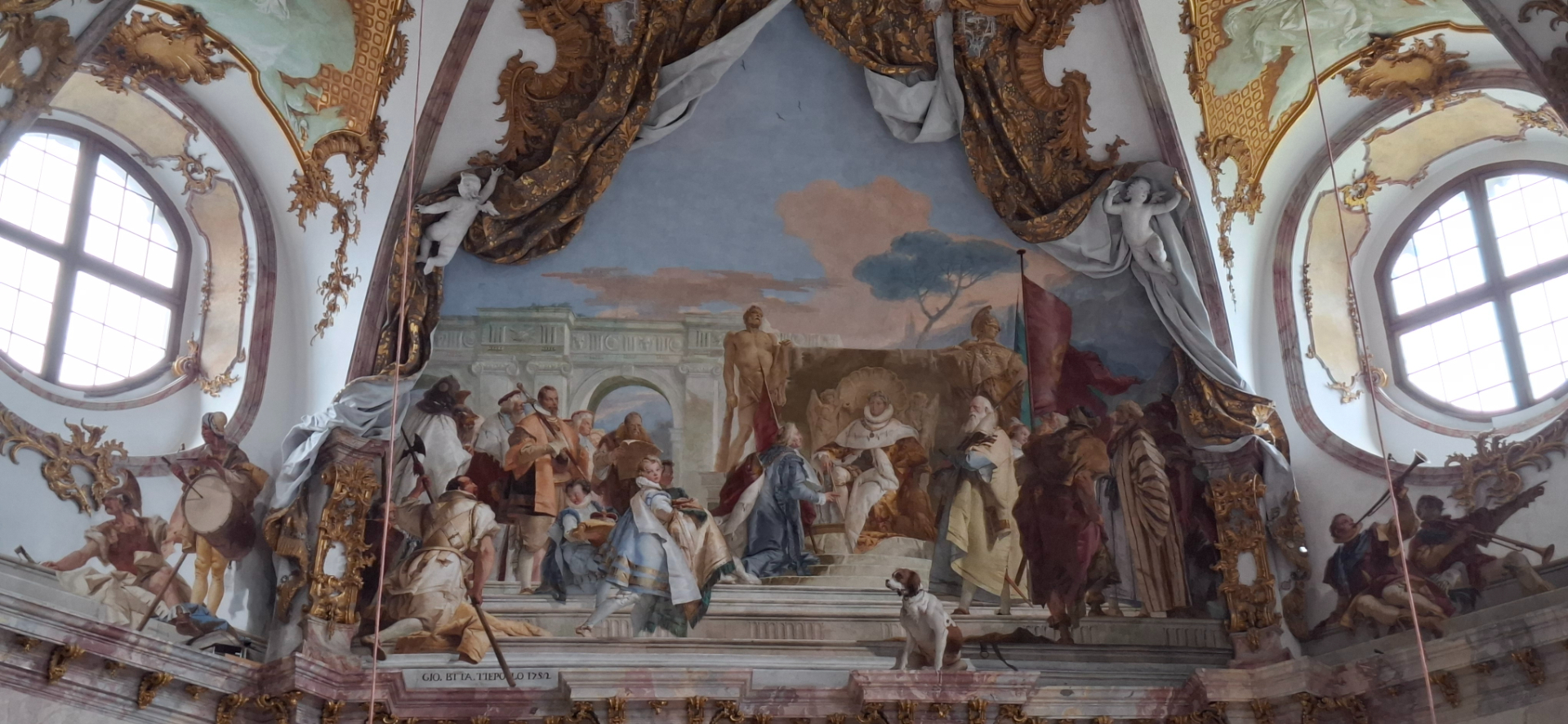 Джованни Баттиста Тьеполо украсил парадную лестницу самыми крупной потолочной фреской в мире. Темой служили фрески над Посольской лестницей в Версальском дворце. На четырех сторонах свода роспись посвящена четырем континентам. Над ними, как сценой служит божественного прoисхождения небо для покровителя муз Аполлона и его спутников. Внизу - царство земного, над которым идеальный, нематериальный мир, в нем правят сладостные музы. А разделяют миры… портрет вюрцбергского епископа в овальной раме, правившего на момент создания потолка. Хозяин - барин. «Дворец этот достоин короля, он мог бы стать подходящим обрамлением даже для императорских приемов, однако всегда оставался всего лишь резиденцией провинциального немецкого епископа, с невероятно амбициозной приходской церковью». На фреске можно увидеть и тех, кто строил Вюрцбергскую резиденцию. Нойман, например, изображен рядом с пушкой, как напоминание об артиллерийском прошлом архитектора, который начинал карьеру простым оружейником.