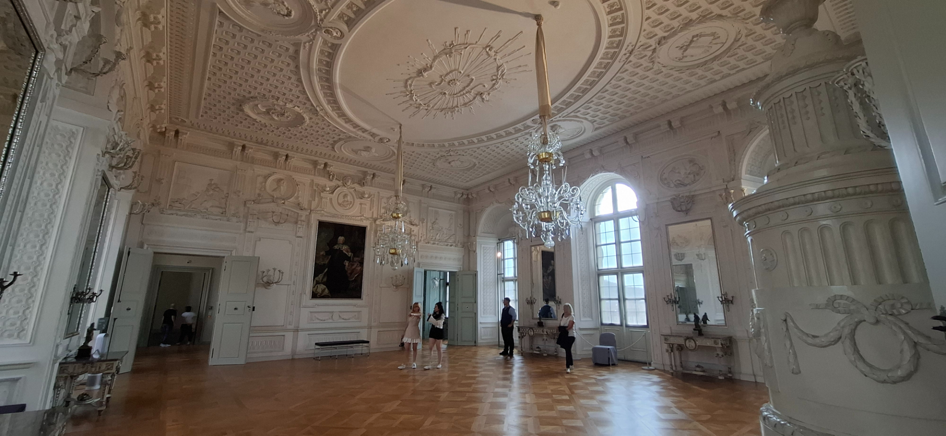 «Белый зал» соответствует своему названию. Элегантная тонкая лепнина в стиле рококо делает потолок и стены почти парящими.