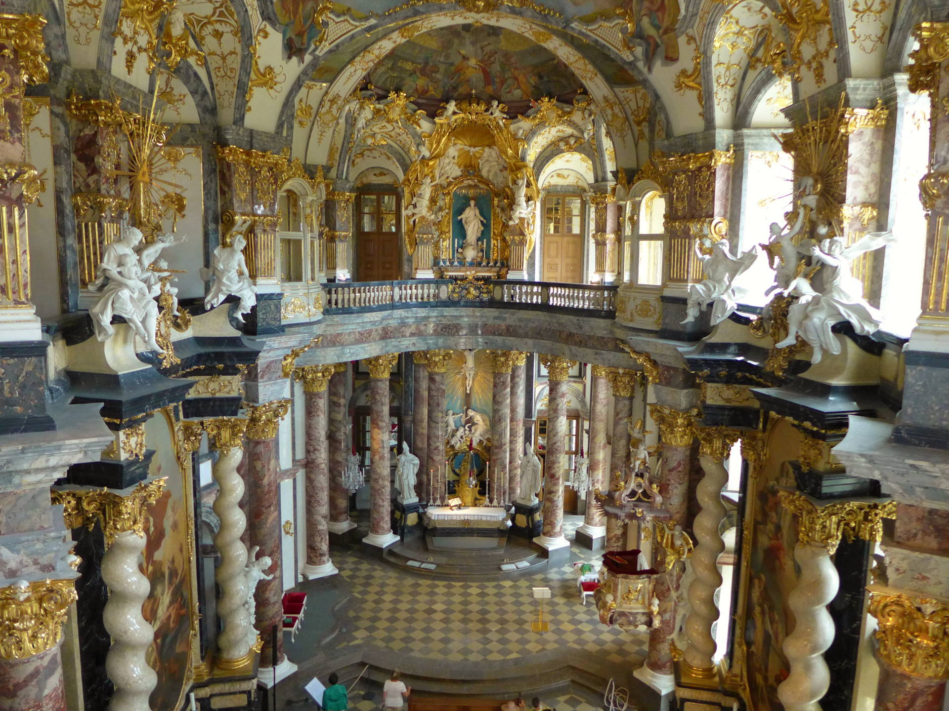К сожалению, не посетила придворную церковь. Она не видна, так как входит в комплекс дворца. Как найти, надо спрашивать у музейных работников. Обидно, что я знала перед поездкой о ней, но вышла из дворца, забыв о ней. Утешаюсь, что как пишет интернет, она по убранству очень похожа на Азамкирхе в Мюнхене. Там я приложила все усилия, чтобы найти необыкновенно красивый домовой храм братьев Азам. Будущим путешественникам на заметку в Вюрцбурге - спрашивайте, ищите и найдите эту красивую достопримечательность. Фото из интернета.