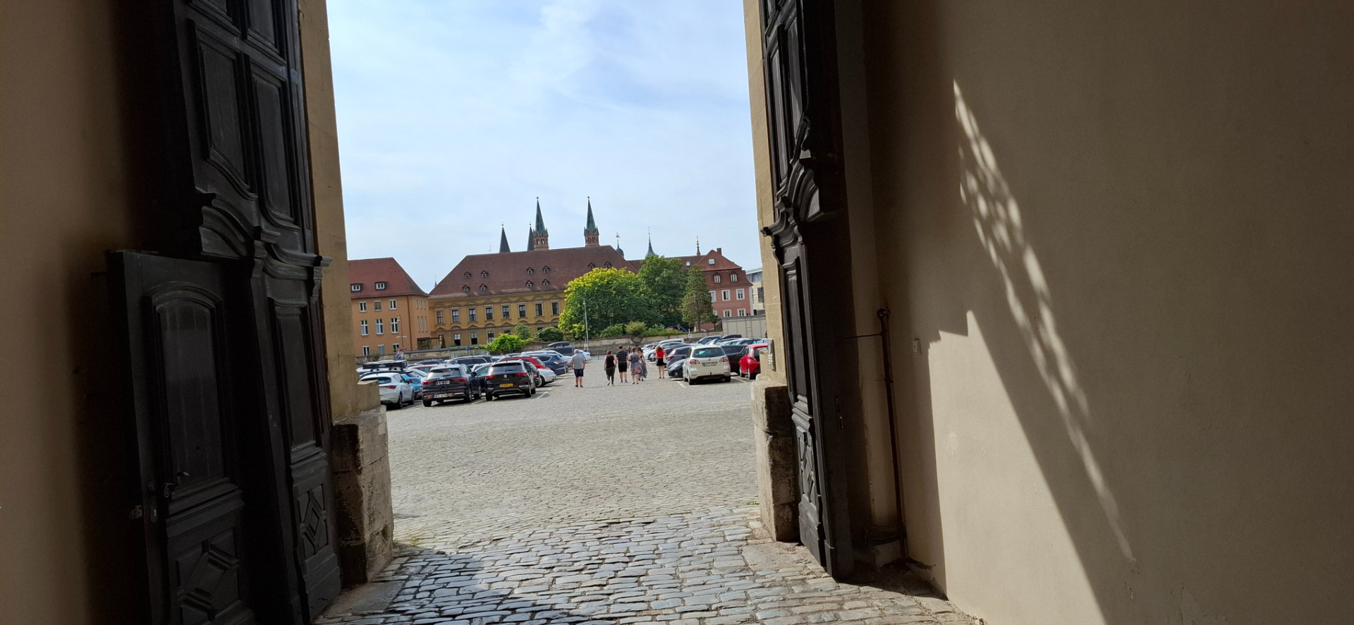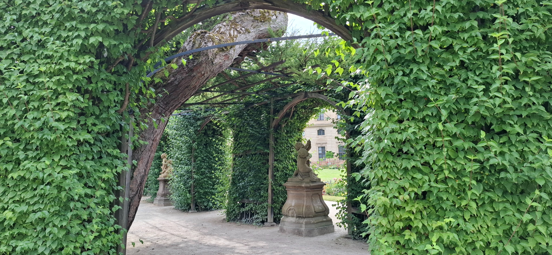 И напоследок садик вокруг Резиденции, вход бесплатный. Он маленький, если не углубляться в «кольцевой парк», с которым они образуют единую зеленую зону города. Раньше епископы попадали в него через Садовый зал/Gartensaal на первом этаже резиденции. В наши дни туристам приходится идти в обход, надо выйти из дворца, потом через кованые Садовые ворота/Hofgartentor, расположенные на Дворцовой площади.
